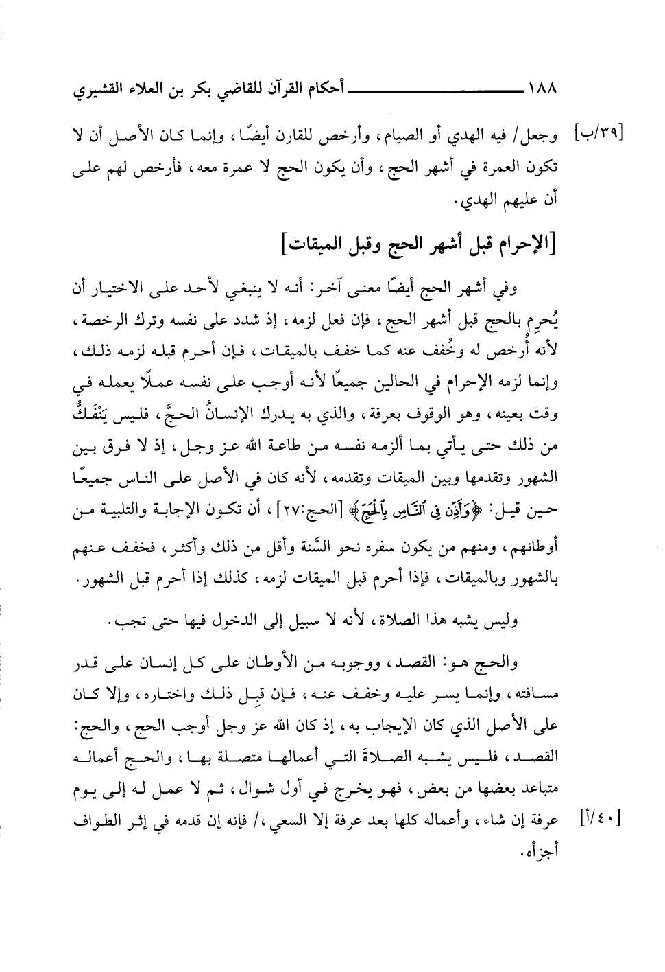 وفي أشهر الحج أيضًا معنى آخر: أنه لا ينبغي لأحد على الاختيار أن يُحرِم بالحج قبل أشهر الحج، فإن فعل لزمه، إذ شدد على نفسه وترك الرخصة، لأنه أُرخص له وخُفف عنه كما خفف بالميقات، فإن أحرم قبله لزمه ذلك، وإنما لزمه الإحرام في الحالين جميعًا لأنه أوجب على نفسه عملًا يعمله في وقت بعينه، وهو الوقوف بعرفة، والذي به يدرك الإنسانُ الحجَّ، فليس يَنْفَكُّ من ذلك حتى يأتي بما ألزمه نفسه من طاعة اللَّه عز وجل، إذ لا فرق بين الشهور وتقدمها وبين الميقات وتقدمه، لأنه كان في الأصل على الناس جميعًا حين قيل: {وَأَذِّنْ فِي النَّاسِ بِالْحَجِّ} [الحج: ٢٧]، أن تكون الإجابة والتلبية من أوطانهم، ومنهم من يكون سفره نحو السَّنة وأقل من ذلك وأكثر، فخفف عنهم بالشهور وبالميقات، فإذا أحرم قبل الميقات لزمه، كذلك إذا أحرم قبل الشهور.