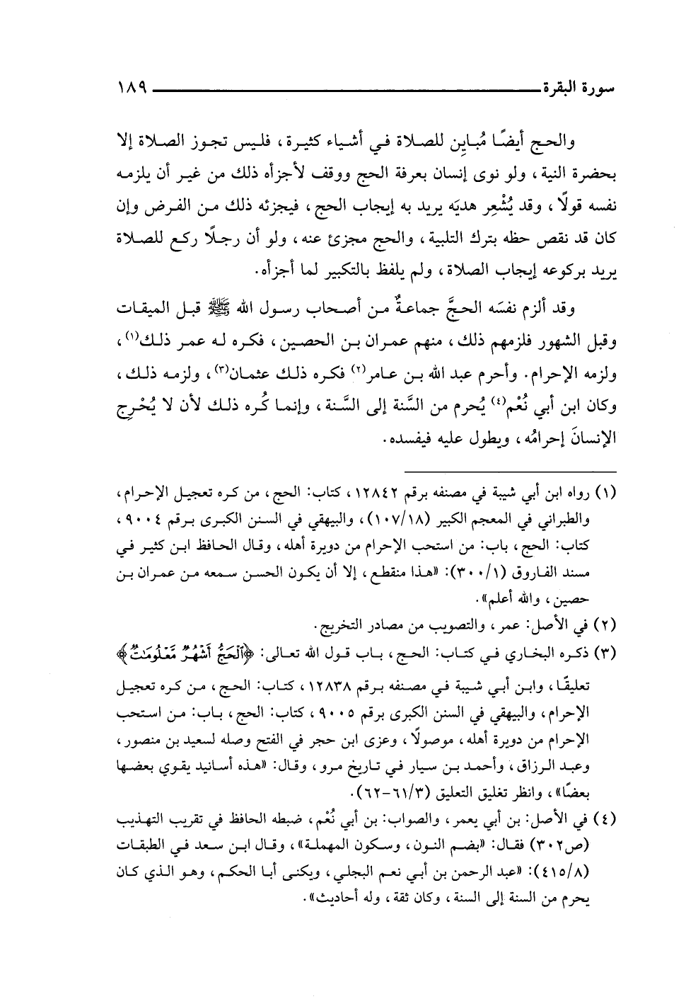 (¬١) رواه ابن أبي شيبة في مصنفه برقم ١٢٨٤ كتاب: الحج، من كره تعجيل الإحرام، والطبراني في المعجم الكبير (١٨/ ١٠٧)، والبيهقي في السنن الكبرى برقم ٩٠٠٤، كتاب: الحج، باب: من استحب الإحرام من دويرة أهله، وقال الحافظ ابن كثير في مسند الفاروق (١/ ٣٠٠): "هذا منقطع، إلا أن يكون الحسن سمعه من عمران بن حصين، واللَّه أعلم".