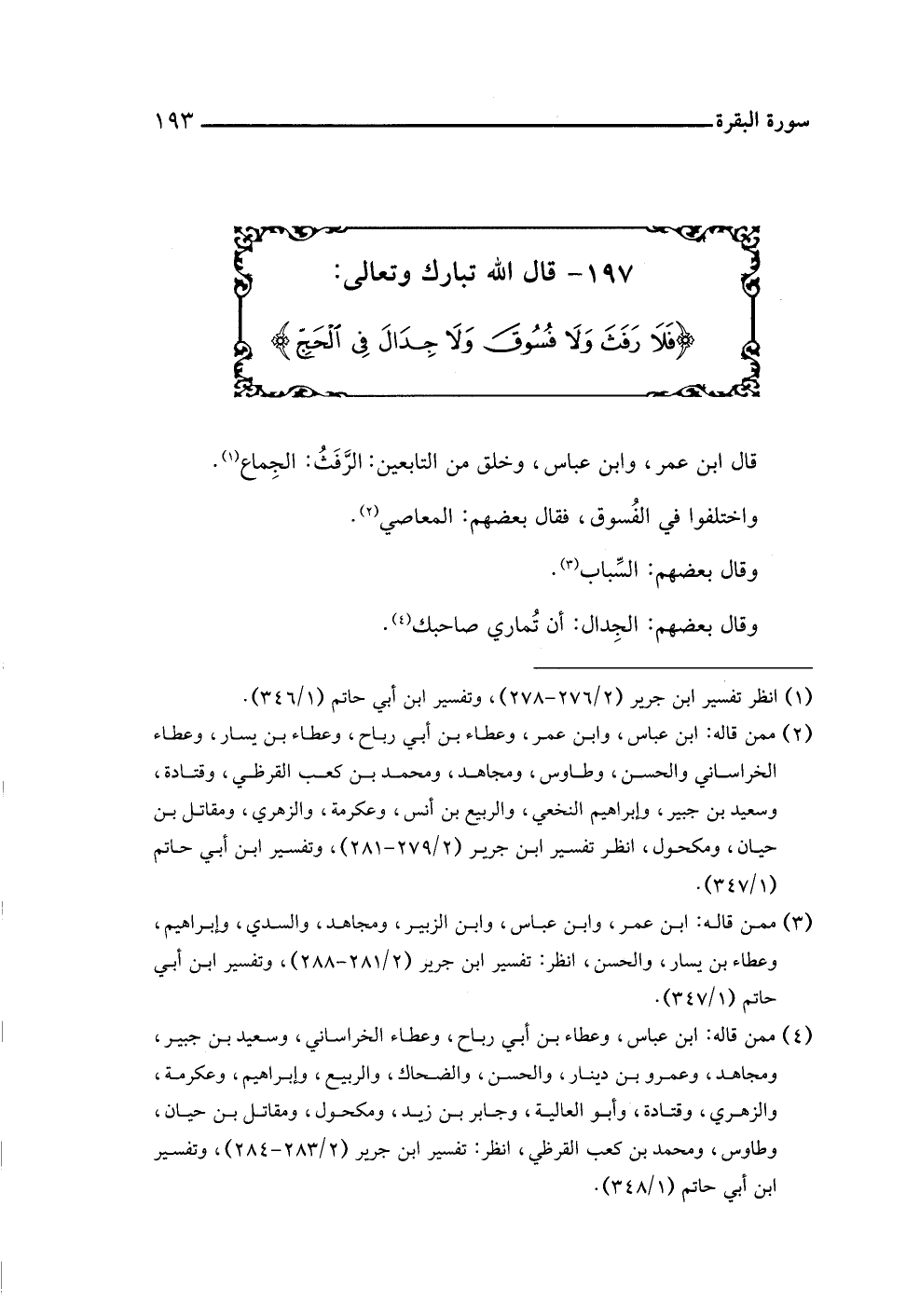 ١٩٧ - قال اللَّه تبارك وتعالى: {فَلَا رَفَثَ وَلَا فُسُوقَ وَلَا جِدَالَ فِي الْحَجِّ}