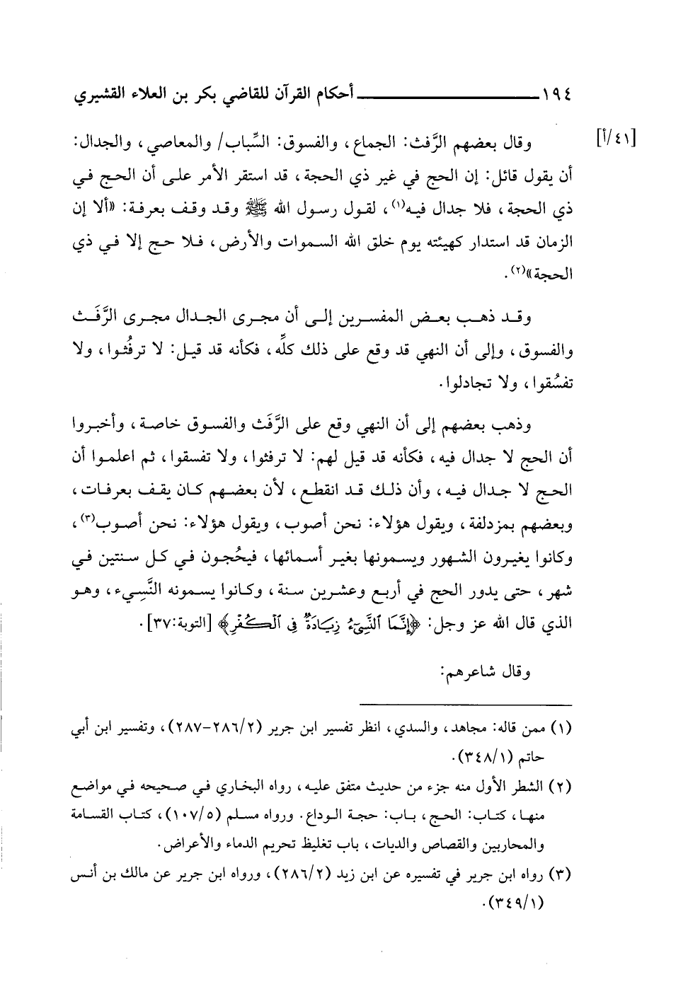 وقال بعضهم الرَّفث: الجماع، والفسوق: السِّباب والمعاصي، والجدال: أن يقول قائل: إن الحج في غير ذي الحجة، قد استقر الأمر على أن الحج في ذي الحجة، فلا جدال فيه (¬١)، لقول رسول اللَّه -صلى اللَّه عليه وسلم- وقد وقف بعرفة: "ألا إن الزمان قد استدار كهيئته يوم خلق اللَّه السموات والأرض، فلا حج إلا في ذي الحجة" (¬٢).