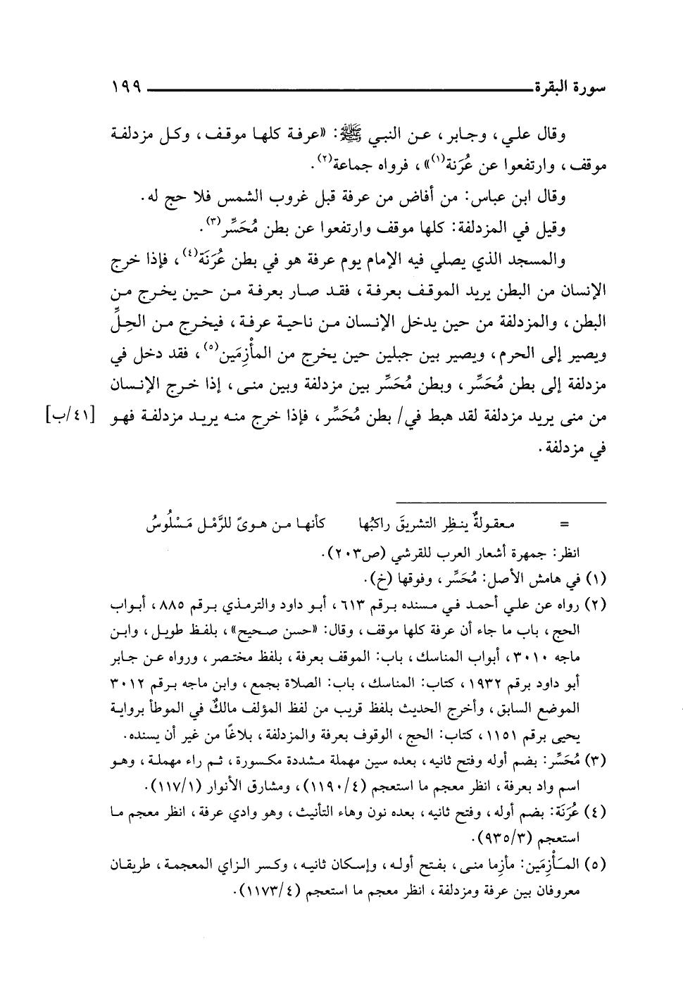 (¬٥) المَأْزِمَين: مأزِما منى، بفتح أوله، واسكان ثانيه، وكسر الزاي المعجمة، طريقان معروفان بين عرفة ومزدلفة، انظر معجم ما استعجم (٤/ ١١٧٣).