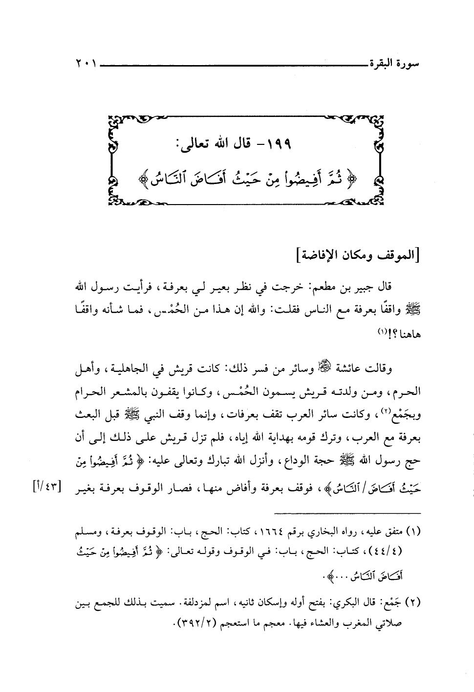 ١٩٩ - قال اللَّه تعالى: {ثُمَّ أَفِيضُوا مِنْ حَيْثُ أَفَاضَ النَّاسُ}