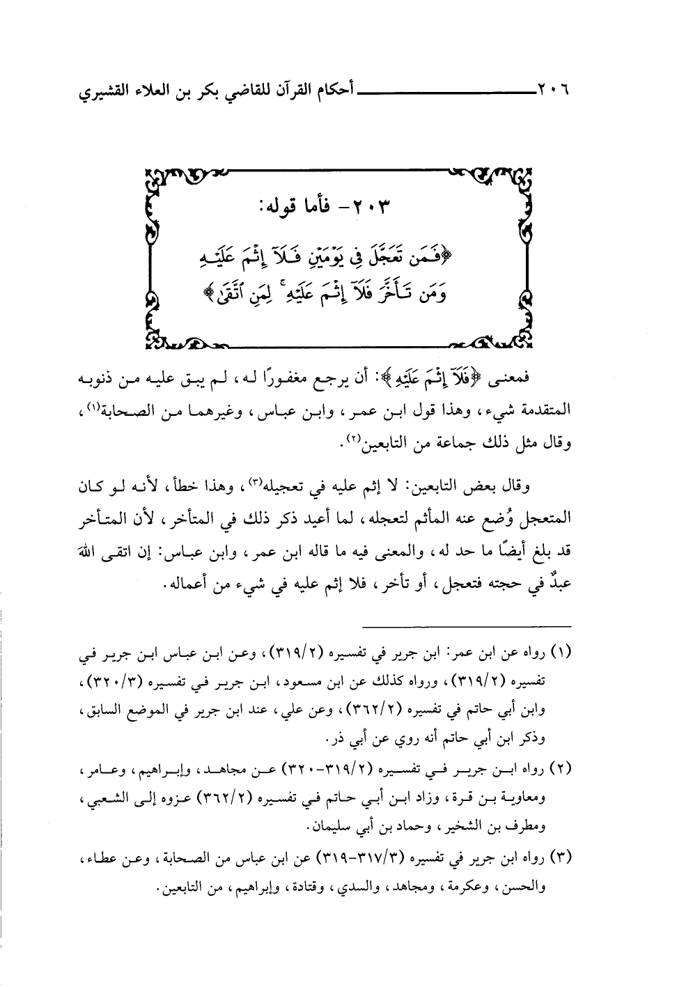 ٢٠٣ - فأما قوله: {فَمَنْ تَعَجَّلَ فِي يَوْمَيْنِ فَلَا إِثْمَ عَلَيْهِ وَمَنْ تَأَخَّرَ فَلَا إِثْمَ عَلَيْهِ لِمَنِ اتَّقَى}