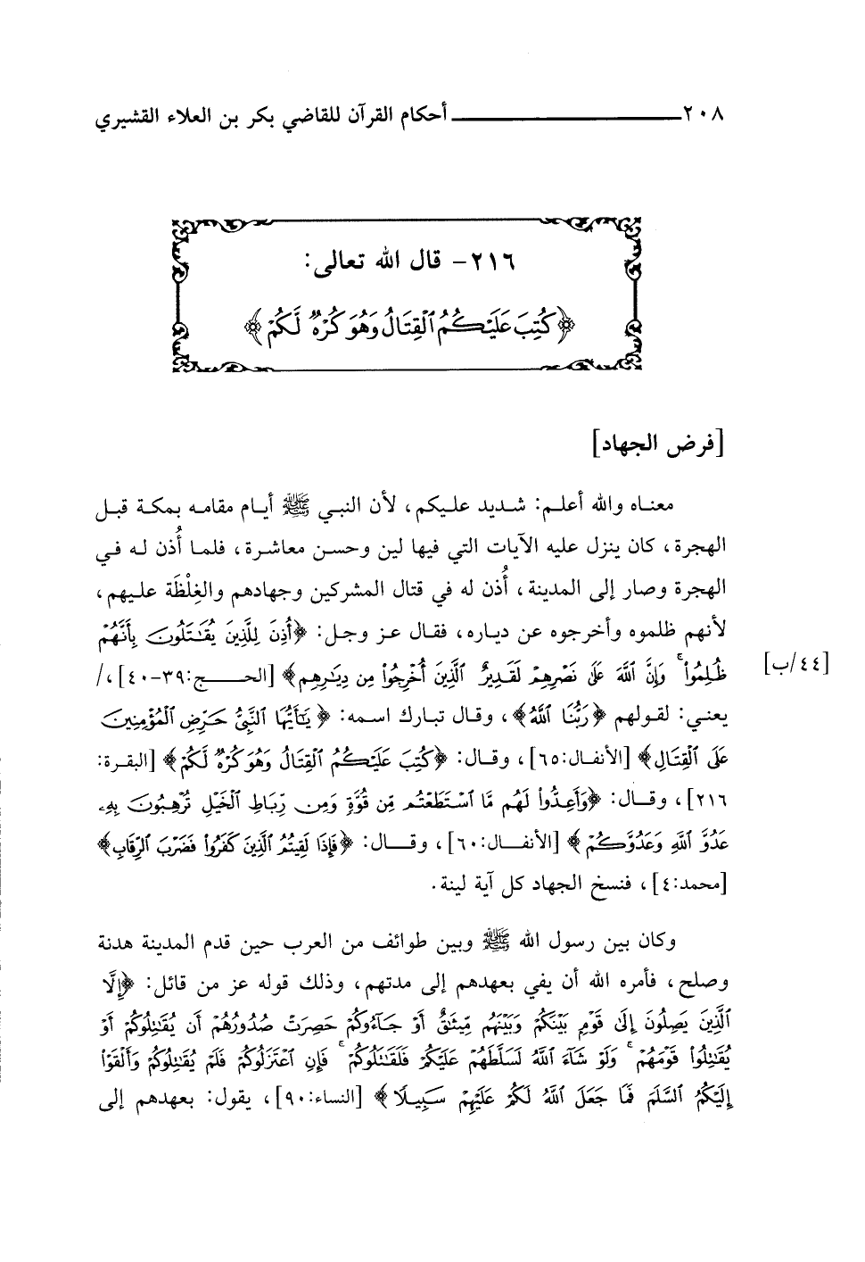 ٢١٦ - قال اللَّه تعالى: {كُتِبَ عَلَيْكُمُ الْقِتَالُ وَهُوَ كُرْهٌ لَكُمْ}