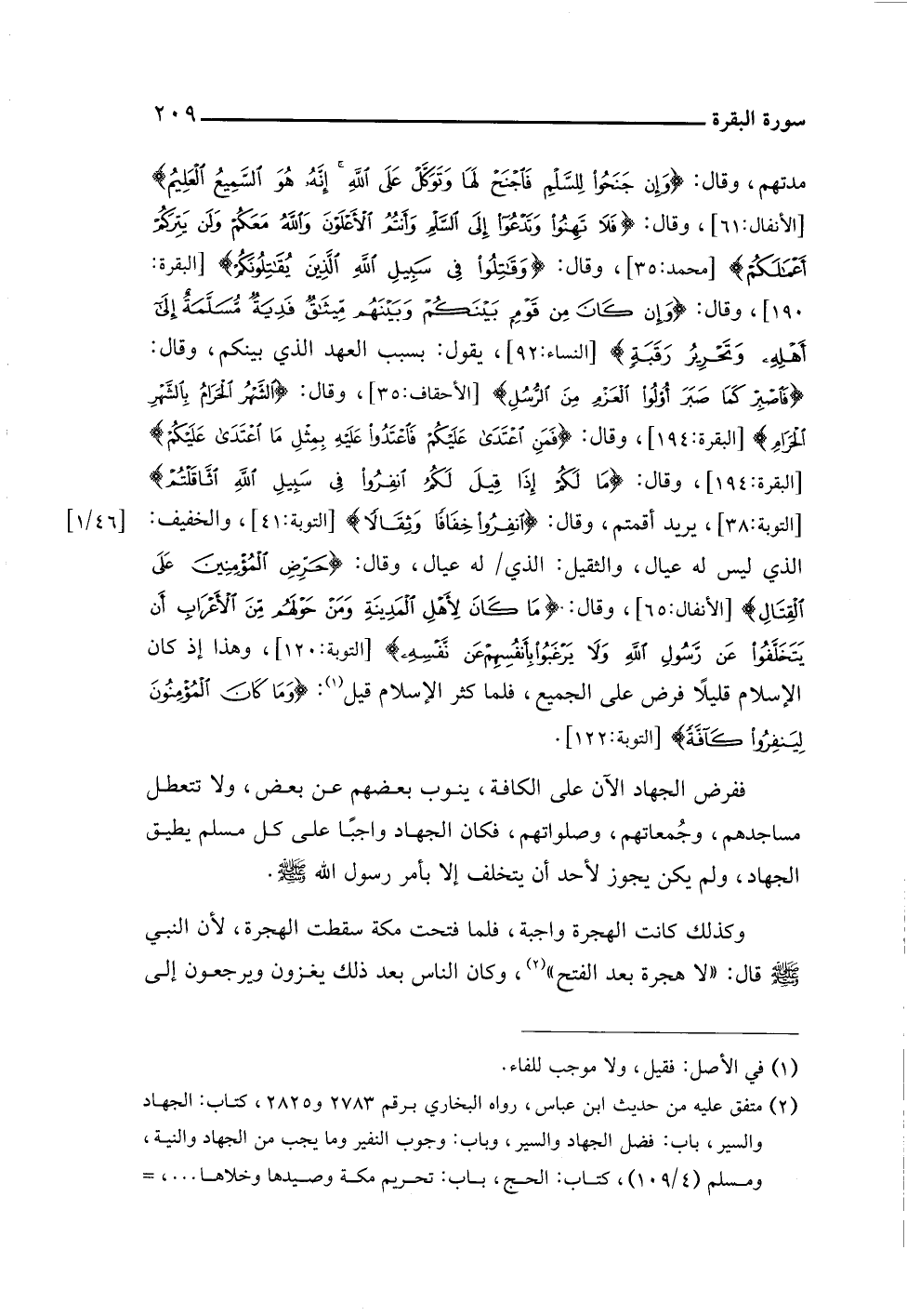(¬٢) متفق عليه من حديث ابن عباس، رواه البخاري برقم ٢٧٨٣ و ٢٨٢٥، كتاب الجهاد والسير، باب: فضل الجهاد والسير، وباب: وجوب النفير وما يجب من الجهاد والنية، ومسلم (٤/ ١٠٩)، كتاب: الحج، باب: تحريم مكة وصيدها وخلاها. . .، =
