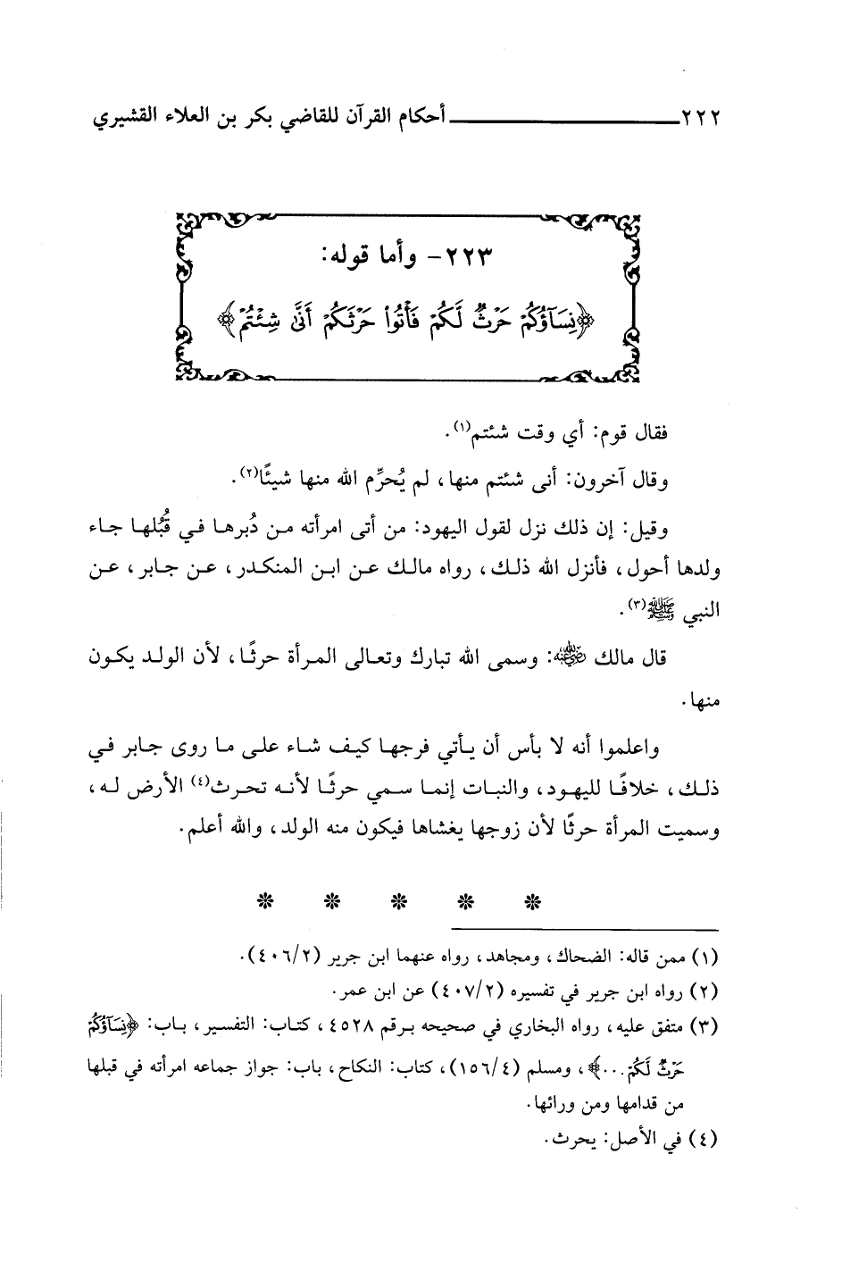 ٢٢٣ - وأما قوله: {نِسَاؤُكُمْ حَرْثٌ لَكُمْ فَأْتُوا حَرْثَكُمْ أَنَّى شِئْتُمْ}