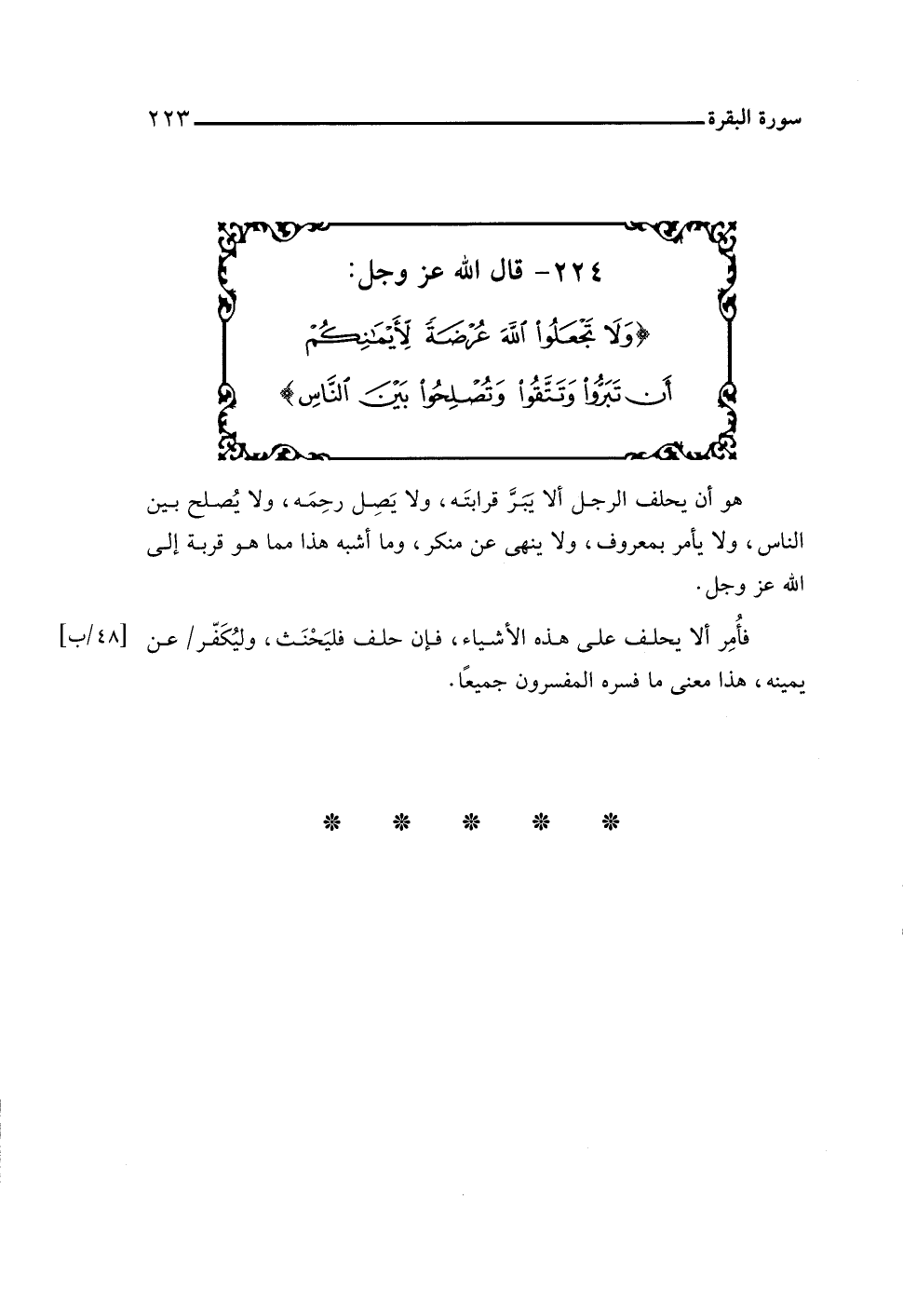 ٢٢٤ - قال اللَّه عز وجل: {وَلَا تَجْعَلُوا اللَّهَ عُرْضَةً لِأَيْمَانِكُمْ أَنْ تَبَرُّوا وَتَتَّقُوا وَتُصْلِحُوا بَيْنَ النَّاسِ}