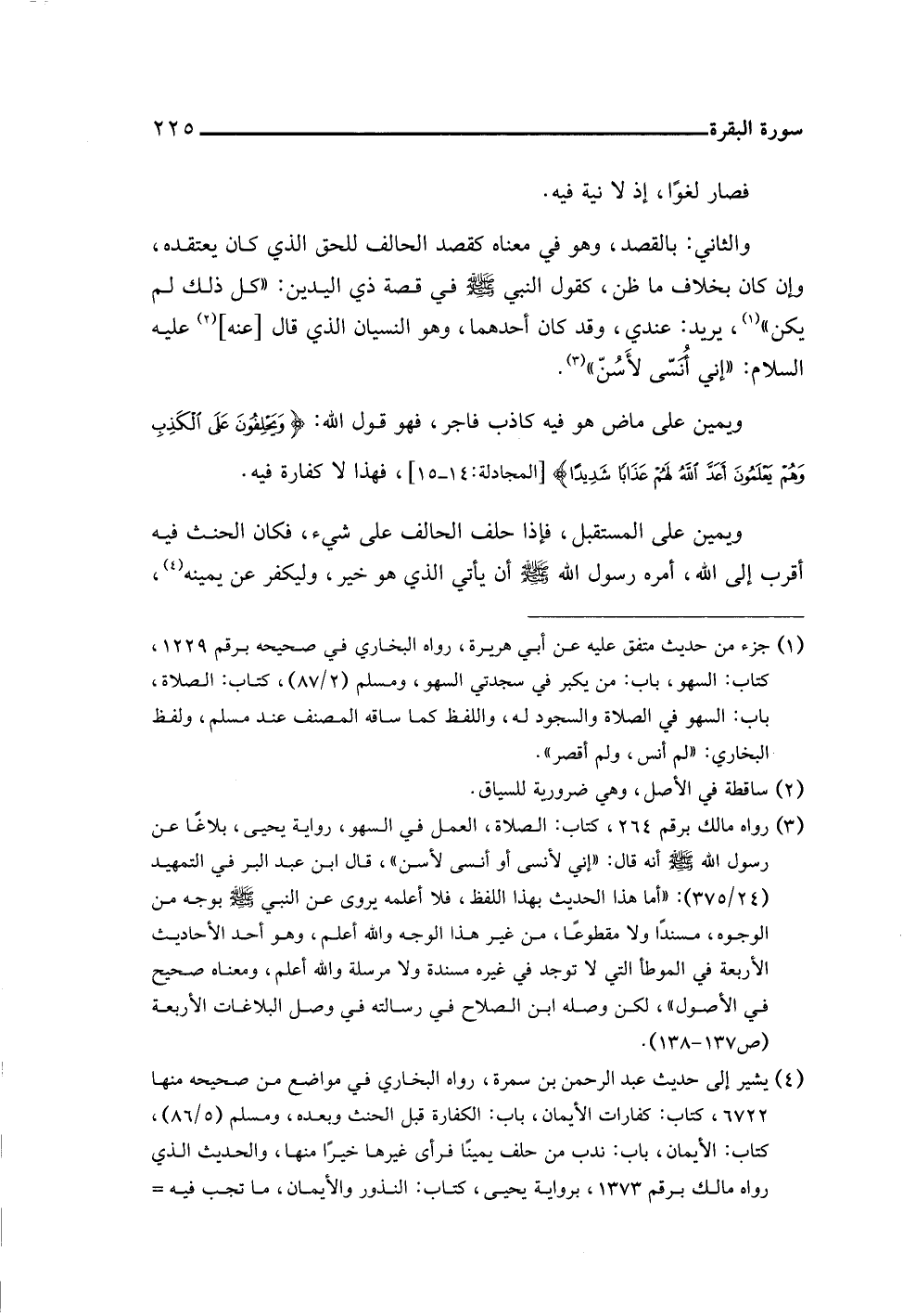 والثاني: بالقصد، وهو في معناه كقصد الحالف للحق الذي كان يعتقده، وإن كان بخلاف ما ظن، كقول النبي -صلى اللَّه عليه وسلم- في قصة ذي اليدين: "كل ذلك لم يكن" (¬١)، يريد: عندي، وقد كان أحدهما، وهو النسيان الذي قال [عنه] (¬٢) عليه السلام: "إني أُنَسّى لأَسُنّ" (¬٣).