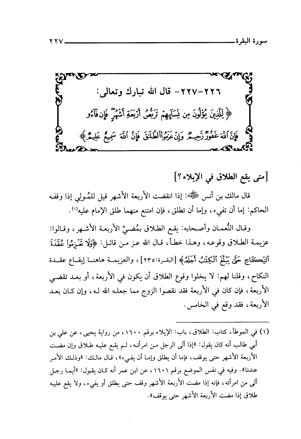 ٢٢٧ - ٢٢٦ - قال اللَّه تبارك وتعالى: {لِلَّذِينَ يُؤْلُونَ مِنْ نِسَائِهِمْ تَرَبُّصُ أَرْبَعَةِ أَشْهُرٍ فَإِنْ فَاءُوا فَإِنَّ اللَّهَ غَفُورٌ رَحِيمٌ (٢٢٦) وَإِنْ عَزَمُوا الطَّلَاقَ فَإِنَّ اللَّهَ سَمِيعٌ عَلِيمٌ}