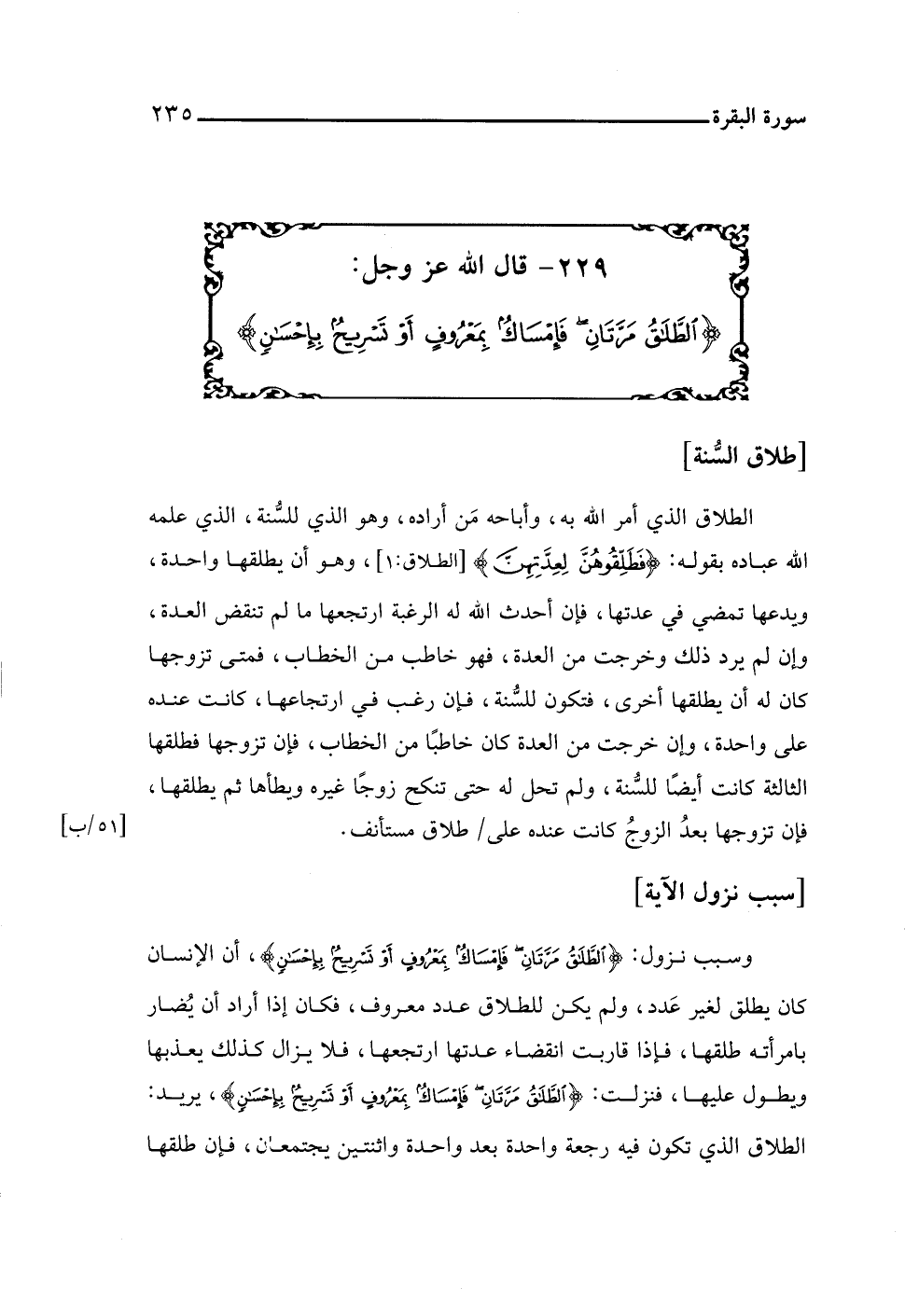٢٢٩ - قال اللَّه عز وجل: {الطَّلَاقُ مَرَّتَانِ فَإِمْسَاكٌ بِمَعْرُوفٍ أَوْ تَسْرِيحٌ بِإِحْسَانٍ}