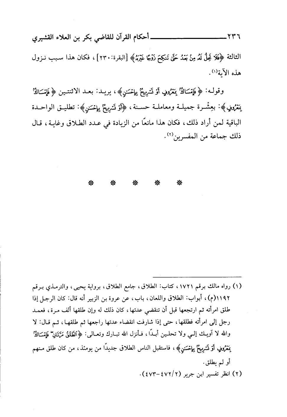 (¬١) رواه مالك برقم ١٧٢١، كتاب: الطلاق، جامع الطلاق، برواية يحيى، والترمذي برقم ١١٩٢ (م)، أبواب: الطلاق واللعان، باب، عن عروة بن الزبير أنه قال: كان الرجل إذا طلق امرأته ثم ارتجعها قبل أن تنقضي عدتها، كان ذلك له وإن طلقها ألف مرة، فعمد رجل إلى امرأته فطلقها، حتى إذا شارفت انقضاء عدتها راجعها ثم طلقها، ثم قال: لا واللَّه لا آويك إلي ولا تحلين أبدًا، فأنزل اللَّه تبارك وتعالى: {الطَّلَاقُ مَرَّتَانِ فَإِمْسَاكٌ بِمَعْرُوفٍ أَوْ تَسْرِيحٌ بِإِحْسَانٍ}، فاستقبل الناس الطلاق جديدًا من يومئذ، من كان طلق منهم أو لم يطلق.