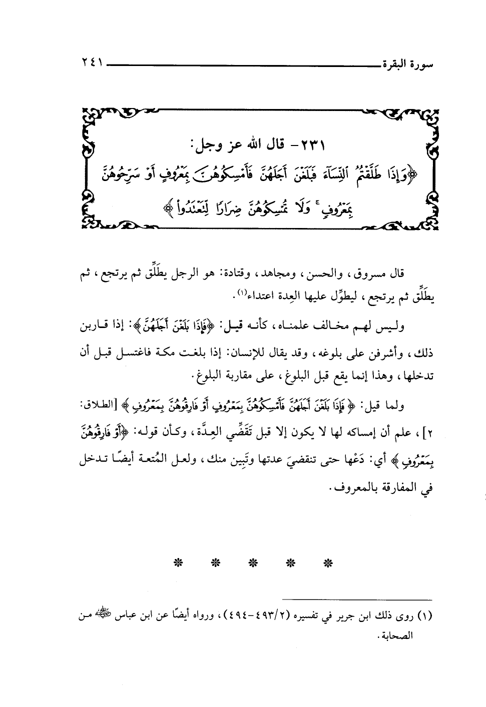 ٢٣١ - قال اللَّه عز وجل: {وَإِذَا طَلَّقْتُمُ النِّسَاءَ فَبَلَغْنَ أَجَلَهُنَّ فَأَمْسِكُوهُنَّ بِمَعْرُوفٍ أَوْ سَرِّحُوهُنَّ بِمَعْرُوفٍ وَلَا تُمْسِكُوهُنَّ ضِرَارًا لِتَعْتَدُوا}