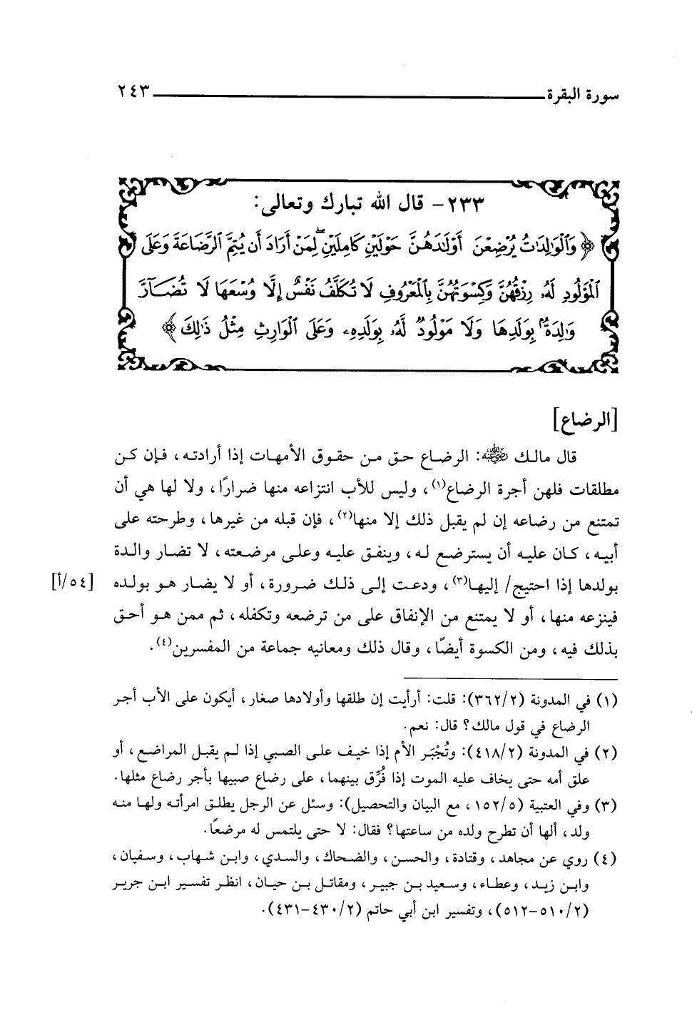 ٢٣٣ - قال اللَّه تبارك وتعالى: {وَالْوَالِدَاتُ يُرْضِعْنَ أَوْلَادَهُنَّ حَوْلَيْنِ كَامِلَيْنِ لِمَنْ أَرَادَ أَنْ يُتِمَّ الرَّضَاعَةَ وَعَلَى الْمَوْلُودِ لَهُ رِزْقُهُنَّ وَكِسْوَتُهُنَّ بِالْمَعْرُوفِ لَا تُكَلَّفُ نَفْسٌ إِلَّا وُسْعَهَا لَا تُضَارَّ وَالِدَةٌ بِوَلَدِهَا وَلَا مَوْلُودٌ لَهُ بِوَلَدِهِ وَعَلَى الْوَارِثِ مِثْلُ ذَلِكَ}
