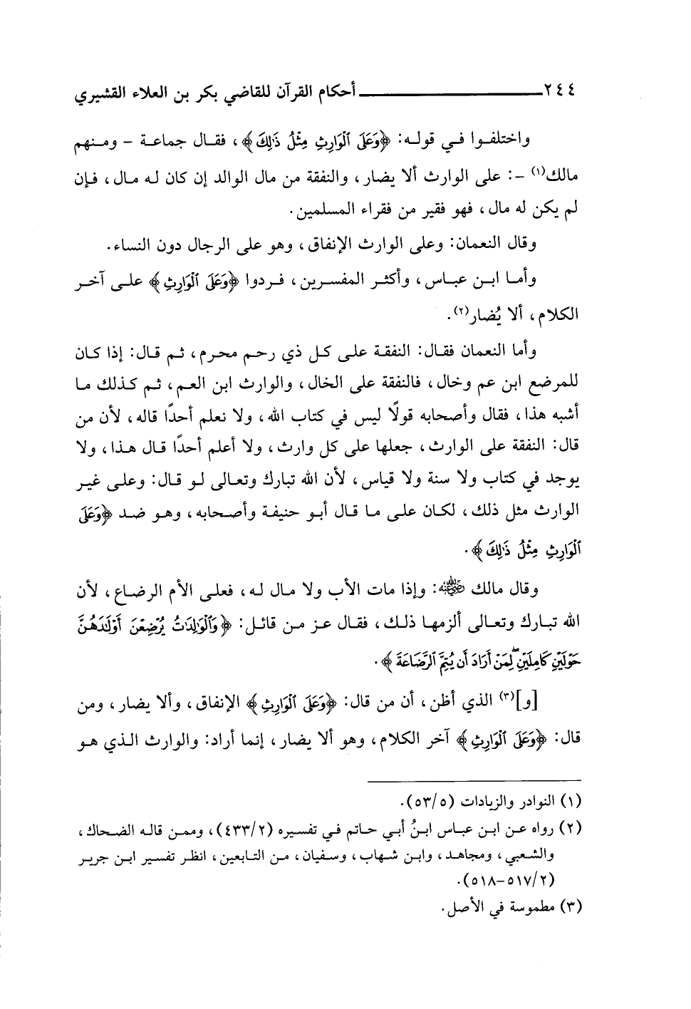[و] (¬٣) الذي أظن، أن من قال: {وَعَلَى الْوَارِثِ} الإنفاق، وألا يضار، ومن قال: {وَعَلَى الْوَارِثِ} آخر الكلام، وهو ألا يضار، إنما أراد: والوارث الذي هو