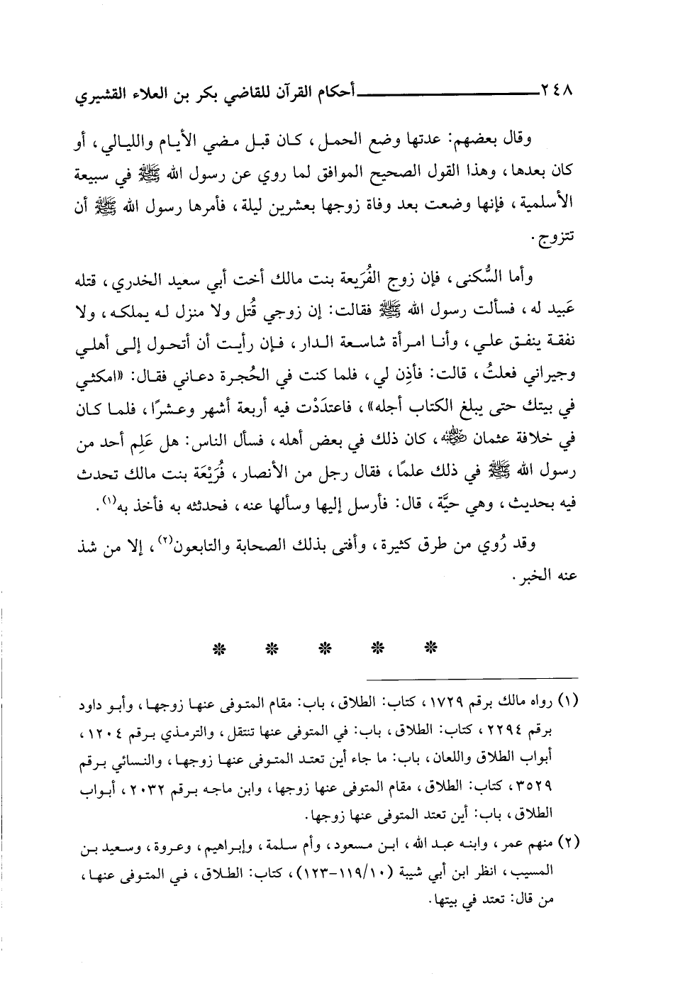 (¬١) رواه مالك برقم ١٧٢٩، كتاب: الطلاق، باب: مقام المتوفى عنها زوجها، وأبو داود برقم ٢٢٩ كتاب: الطلاق، باب: في المتوفى عنها تنتقل، والترمذي برقم ١٢٠٤، أبواب الطلاق واللعان، باب: ما جاء أين تعتد المتوفى عنها زوجها، والنسائي برقم ٣٥٢٩، كتاب: الطلاق، مقام المتوفى عنها زوجها، وابن ماجة برقم ٢٠٣٢، أبواب الطلاق، باب: أين تعتد المتوفى عنها زوجها.