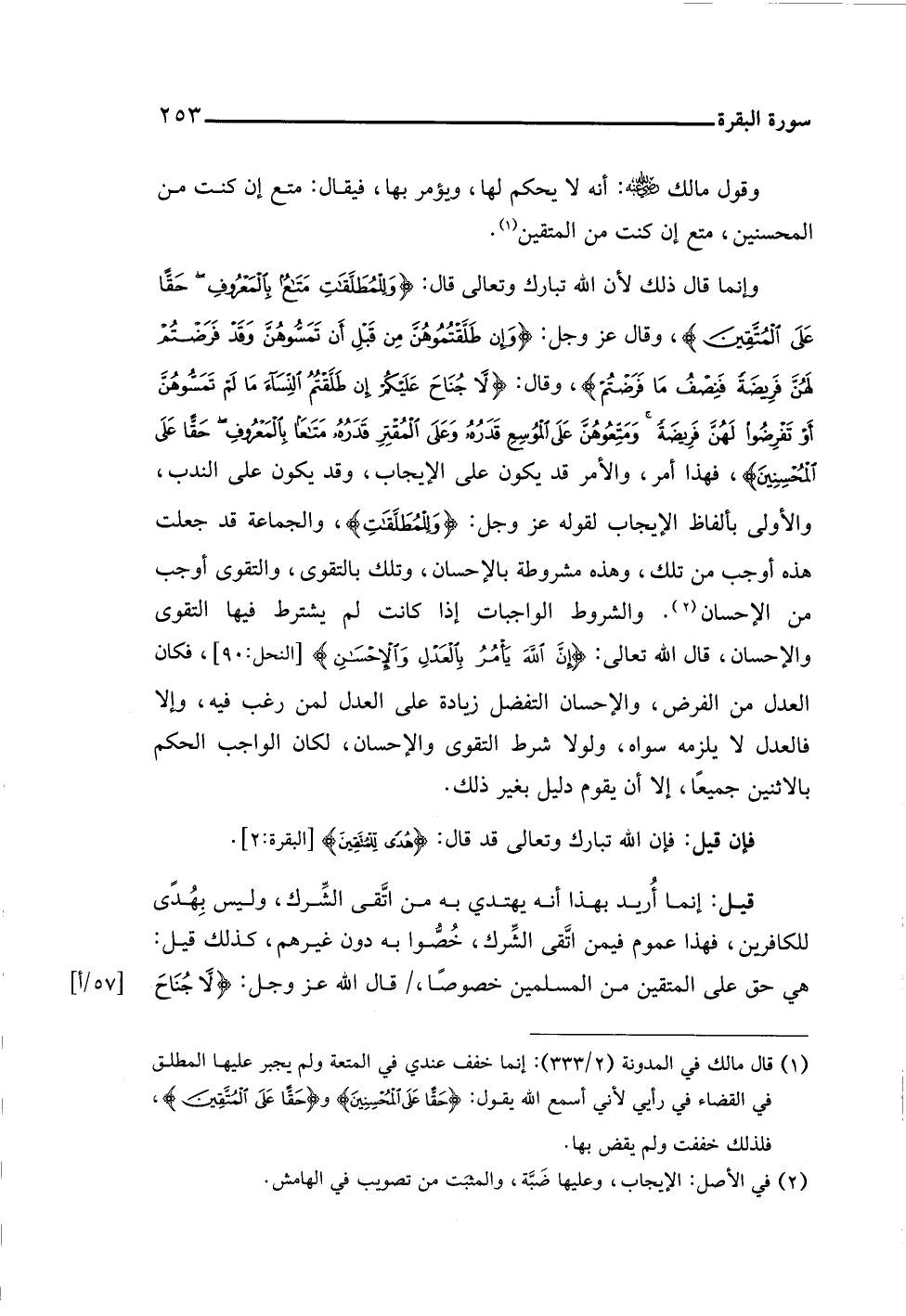 وإنما قال ذلك لأن اللَّه تبارك وتعالى قال: {وَلِلْمُطَلَّقَاتِ مَتَاعٌ بِالْمَعْرُوفِ حَقًّا عَلَى الْمُتَّقِينَ}، وقال عز وجل: {وَإِنْ طَلَّقْتُمُوهُنَّ مِنْ قَبْلِ أَنْ تَمَسُّوهُنَّ وَقَدْ فَرَضْتُمْ لَهُنَّ فَرِيضَةً فَنِصْفُ مَا فَرَضْتُمْ}، وقال: {لَا جُنَاحَ عَلَيْكُمْ إِنْ طَلَّقْتُمُ النِّسَاءَ مَا لَمْ تَمَسُّوهُنَّ أَوْ تَفْرِضُوا لَهُنَّ فَرِيضَةً وَمَتِّعُوهُنَّ عَلَى الْمُوسِعِ قَدَرُهُ وَعَلَى الْمُقْتِرِ قَدَرُهُ مَتَاعًا بِالْمَعْرُوفِ حَقًّا عَلَى الْمُحْسِنِينَ}، فهذا أمر، والأمر قد يكون على الإيجاب، وقد يكون على الندب، والأولى بالفاظ الإيجاب لقوله عز وجل: {وَلِلْمُطَلَّقَاتِ}، والجماعة قد جعلت هذه أوجب من تلك، وهذه مشروطة بالإحسان، وتلك بالتقوى، والتقوى أوجب من الإحسان (¬٢). والشروط الواجبات إذا كانت لم يشترط فيها التقوى والإحسان، قال اللَّه تعالى: {إِنَّ اللَّهَ يَأْمُرُ بِالْعَدْلِ وَالْإِحْسَانِ} [النحل: ٩٠]، فكان العدل من الفرض، والإحسان التفضل زيادة على العدل لمن رغب فيه، وإلا فالعدل لا يلزمه سواه، ولولا شرط التقوى والإحسان، لكان الواجب الحكم بالاثنين جميعًا، إلا أن يقوم دليل بغير ذلك.