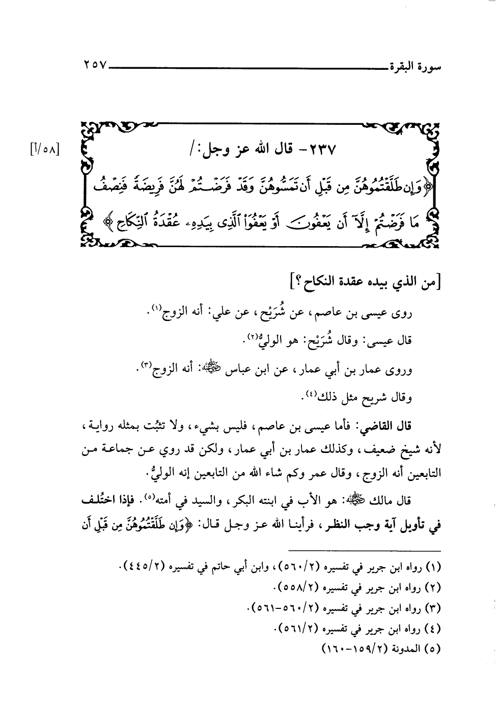 ٢٣٧ - قال اللَّه عز وجل: {وَإِنْ طَلَّقْتُمُوهُنَّ مِنْ قَبْلِ أَنْ تَمَسُّوهُنَّ وَقَدْ فَرَضْتُمْ لَهُنَّ فَرِيضَةً فَنِصْفُ مَا فَرَضْتُمْ إِلَّا أَنْ يَعْفُونَ أَوْ يَعْفُوَ الَّذِي بِيَدِهِ عُقْدَةُ النِّكَاحِ}