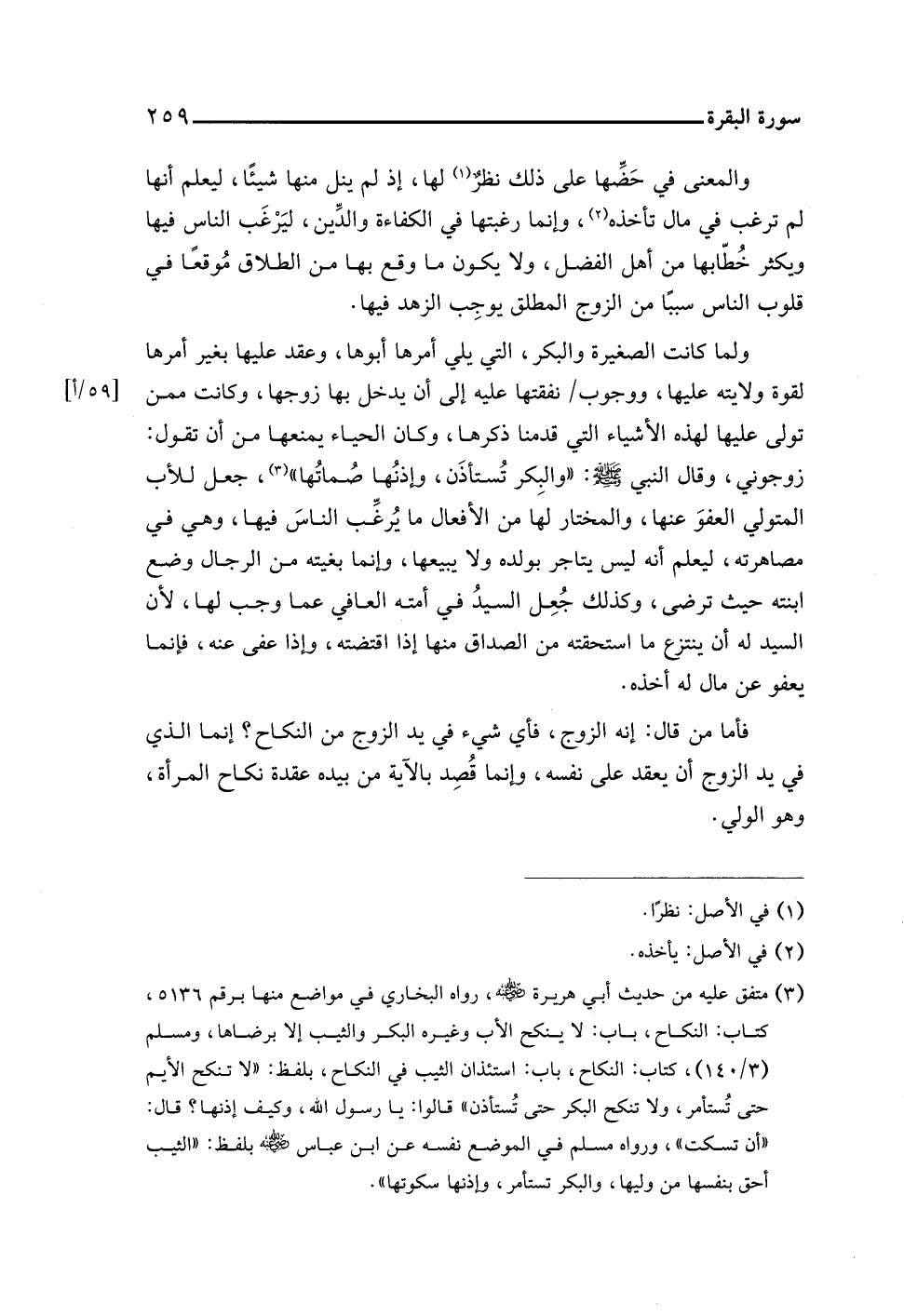 (¬٣) متفق عليه من حديث أبي هريرة -رضي اللَّه عنه-، رواه البخاري في مواضع منها برقم ٥١٣٦، كتاب: النكاح، باب: لا ينكح الأب وغيره البكر والثيب إلا برضاها، ومسلم (٣/ ١٤٠)، كتاب: النكاح، باب: استئذان الثيب في النكاح، بلفظ: "لا تنكح الأيم حتى تُستأمر، ولا تنكح البكر حتى تُستأذن" قالوا: يا رسول اللَّه، وكيف إذنها؟ قال: "أن تسكت"، ورواه مسلم في الموضع نفسه عن ابن عباس -رضي اللَّه عنه- بلفظ: "الثيب أحق بنفسها من وليها، والبكر تستأمر، وإذنها سكوتها".