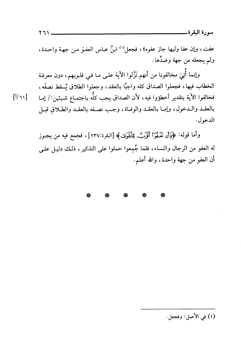 وأما قوله: {وَأَنْ تَعْفُوا أَقْرَبُ لِلتَّقْوَى} [البقرة: ٢٣٧]، فجمع فيه من يجوز له العفو من الرجال والنساء، فلما جُمِعوا حملوا على التذكير، ذلك دليل على أن العفو من جهة واحدة، واللَّه أعلم.