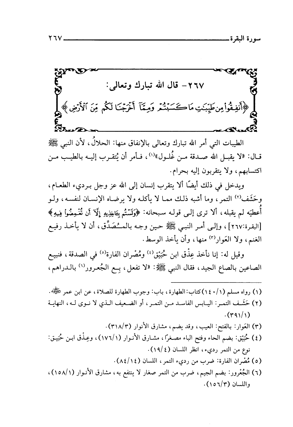 ٢٦٧ - قال اللَّه تبارك وتعالى: {أَنْفِقُوا مِنْ طَيِّبَاتِ مَا كَسَبْتُمْ وَمِمَّا أَخْرَجْنَا لَكُمْ مِنَ الْأَرْضِ}