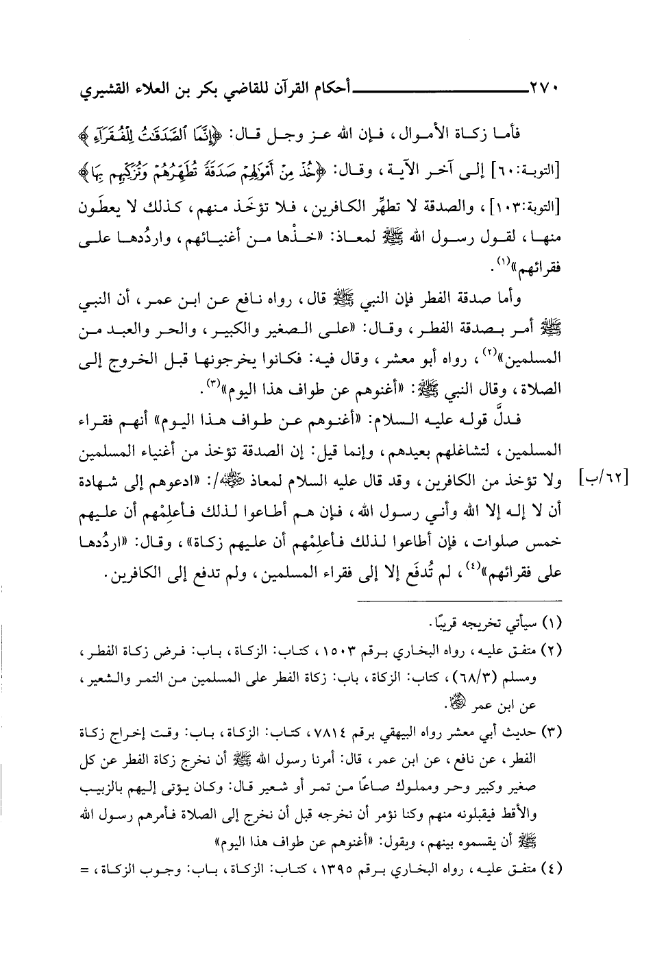 فدلَّ قوله عليه السلام: "أغنوهم عن طواف هذا اليوم" أنهم فقراء المسلمين، لتشاغلهم بعيدهم، وإنما قيل: إن الصدقة تؤخذ من أغنياء المسلمين ولا تؤخذ من الكافرين، وقد قال عليه السلام لمعاذ -رضي اللَّه عنه-: "ادعوهم إلى شهادة أن لا إله إلا اللَّه وأني رسول اللَّه، فإن هم أطاعوا لذلك فأعلِمْهم أن عليهم خمس صلوات، فإن أطاعوا لذلك فأعلِمْهم أن عليهم زكاة"، وقال: "اردُدها على فقرائهم" (¬٤)، لم تُدفَع إلا إلى فقراء المسلمين، ولم تدفع إلى الكافرين.