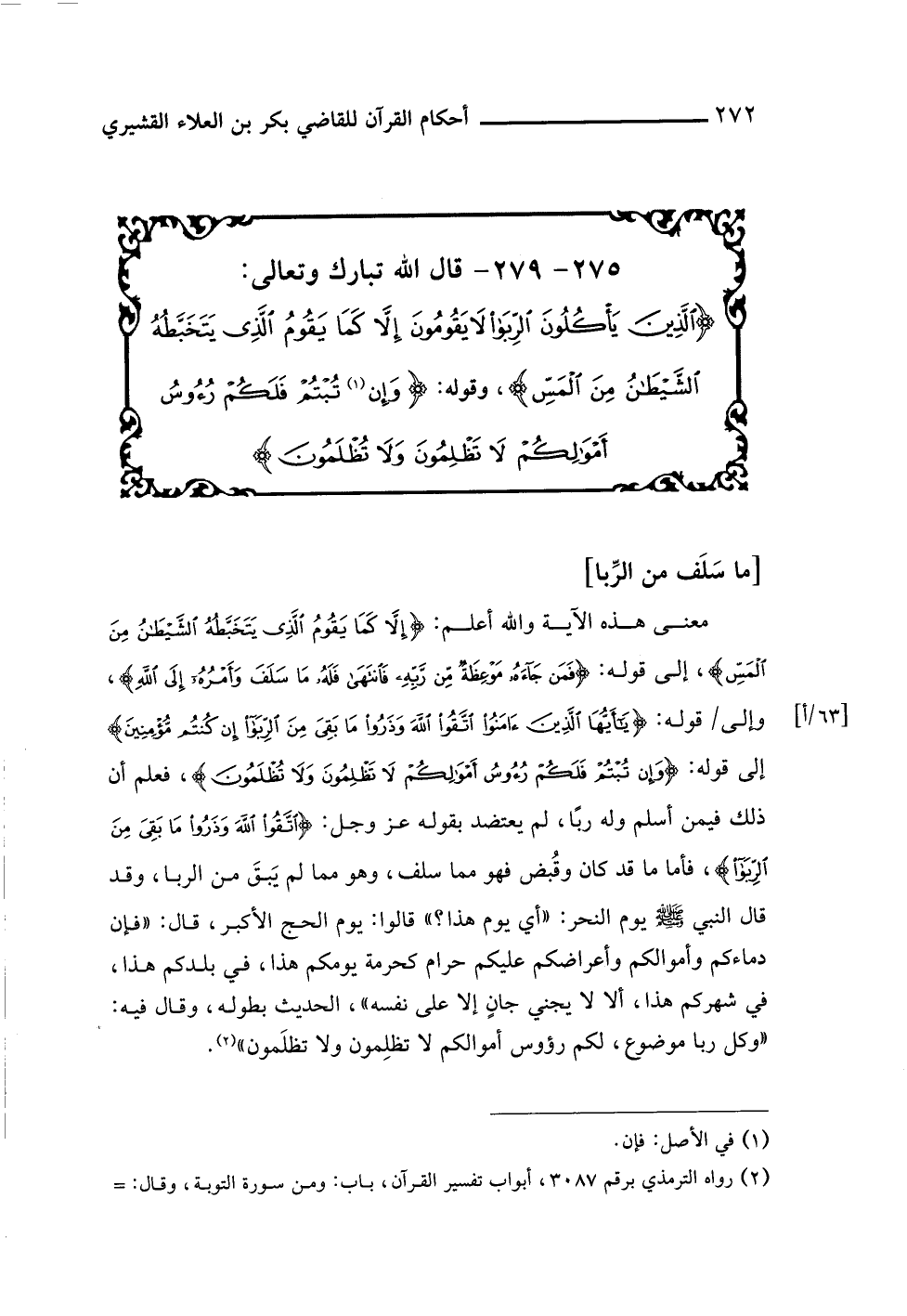 معنى هذه الآية واللَّه أعلم: {إِلَّا كَمَا يَقُومُ الَّذِي يَتَخَبَّطُهُ الشَّيْطَانُ مِنَ الْمَسِّ}، إلى قوله: {فَمَنْ جَاءَهُ مَوْعِظَةٌ مِنْ رَبِّهِ فَانْتَهَى فَلَهُ مَا سَلَفَ وَأَمْرُهُ إِلَى اللَّهِ}، وإلى قوله: {يَاأَيُّهَا الَّذِينَ آمَنُوا اتَّقُوا اللَّهَ وَذَرُوا مَا بَقِيَ مِنَ الرِّبَا إِنْ كُنْتُمْ مُؤْمِنِينَ} إلى قوله: {وَإِنْ تُبْتُمْ فَلَكُمْ رُءُوسُ أَمْوَالِكُمْ لَا تَظْلِمُونَ وَلَا تُظْلَمُونَ}، فعلم أن ذلك فيمن أسلم وله ربًا، لم يعتضد بقوله عز وجل: {اتَّقُوا اللَّهَ وَذَرُوا مَا بَقِيَ مِنَ الرِّبَا}، فأما ما قد كان وقُبض فهو مما سلف، وهو مما لم يَبقَ من الربا، وقد قال النبي -صلى اللَّه عليه وسلم- يوم النحر: "أي يوم هذا؟ " قالوا: يوم الحج الأكبر، قال: "فإن دماءكم وأموالكم وأعراضكم عليكم حرام كحرمة يومكم هذا، في بلدكم هذا، في شهركم هذا، ألا لا يجني جانٍ إلا على نفسه"، الحديث بطوله، وقال فيه: "وكل ربا موضوع، لكم رؤوس أموالكم لا تظلِمون ولا تظلَمون" (¬٢).