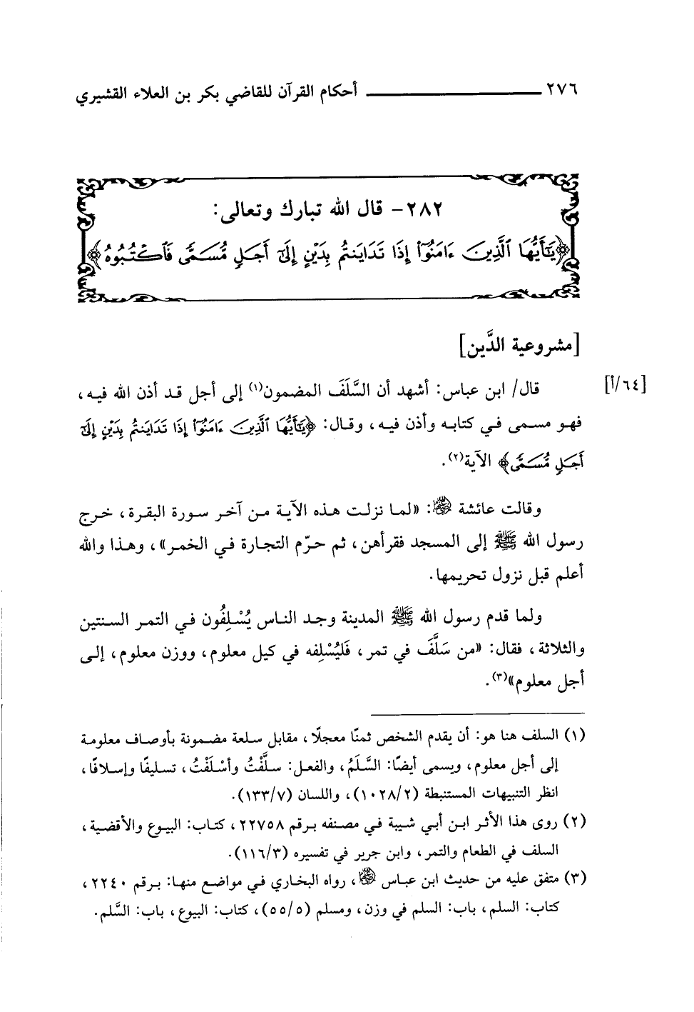 قال ابن عباس: أشهد أن السَّلَفَ المضمون (¬١) إلى أجل قد أذن اللَّه فيه، فهو مسمى في كتابه وأذن فيه، وقال: {يَاأَيُّهَا الَّذِينَ آمَنُوا إِذَا تَدَايَنْتُمْ بِدَيْنٍ إِلَى أَجَلٍ مُسَمًّى} الآية (¬٢).