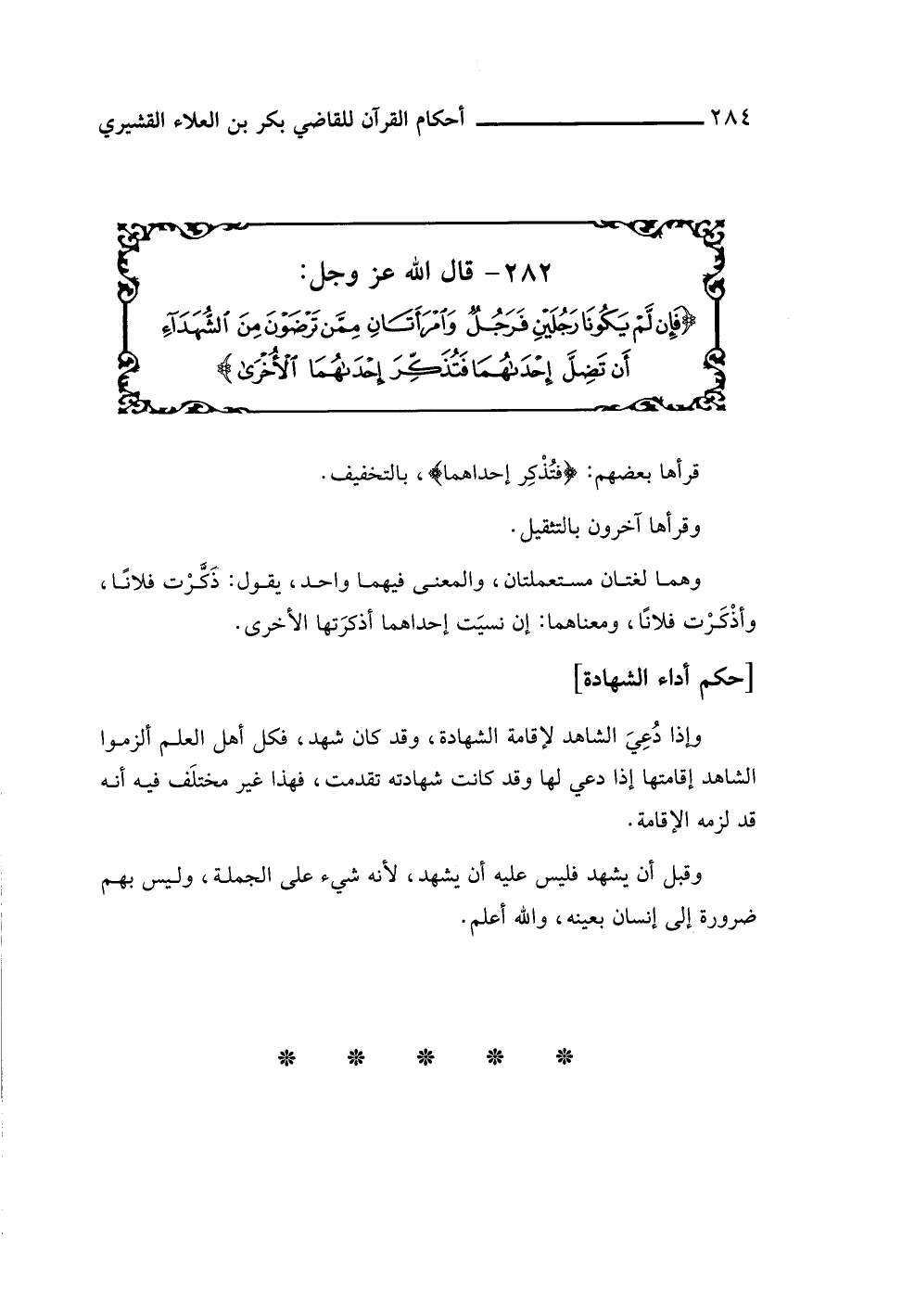 ٢٨٢ - قال اللَّه عز وجل: {فَإِنْ لَمْ يَكُونَا رَجُلَيْنِ فَرَجُلٌ وَامْرَأَتَانِ مِمَّنْ تَرْضَوْنَ مِنَ الشُّهَدَاءِ أَنْ تَضِلَّ إِحْدَاهُمَا فَتُذَكِّرَ إِحْدَاهُمَا الْأُخْرَى}