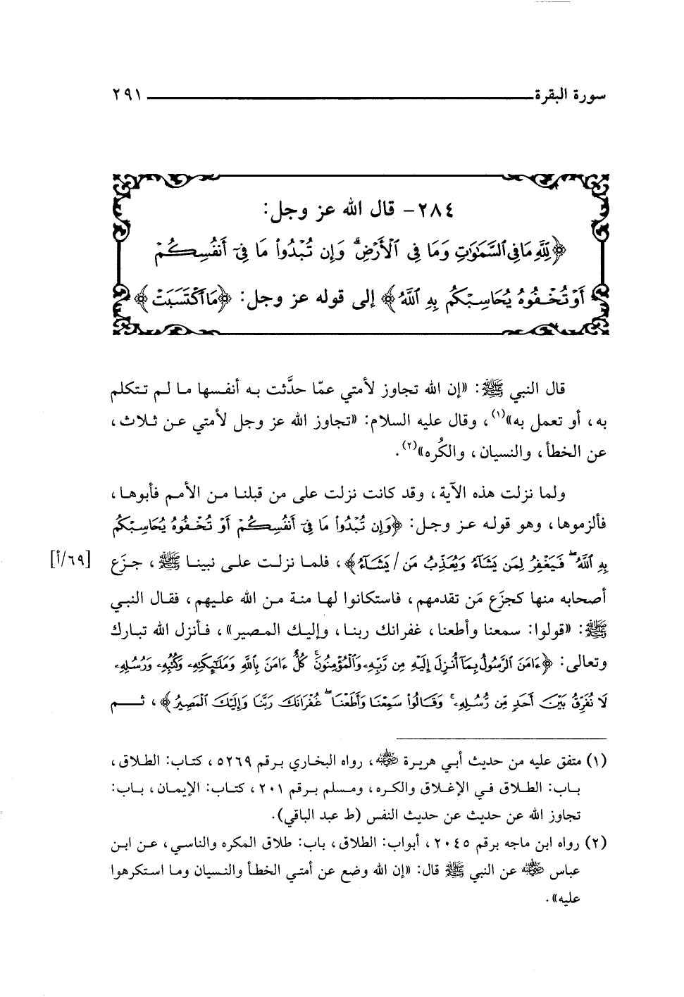 ٢٨٤ - قال اللَّه عز وجل: {لِلَّهِ مَا فِي السَّمَاوَاتِ وَمَا فِي الْأَرْضِ وَإِنْ تُبْدُوا مَا فِي أَنْفُسِكُمْ أَوْ تُخْفُوهُ يُحَاسِبْكُمْ بِهِ اللَّهُ} إلى قوله عز وجل: {مَا اكْتَسَبَتْ}