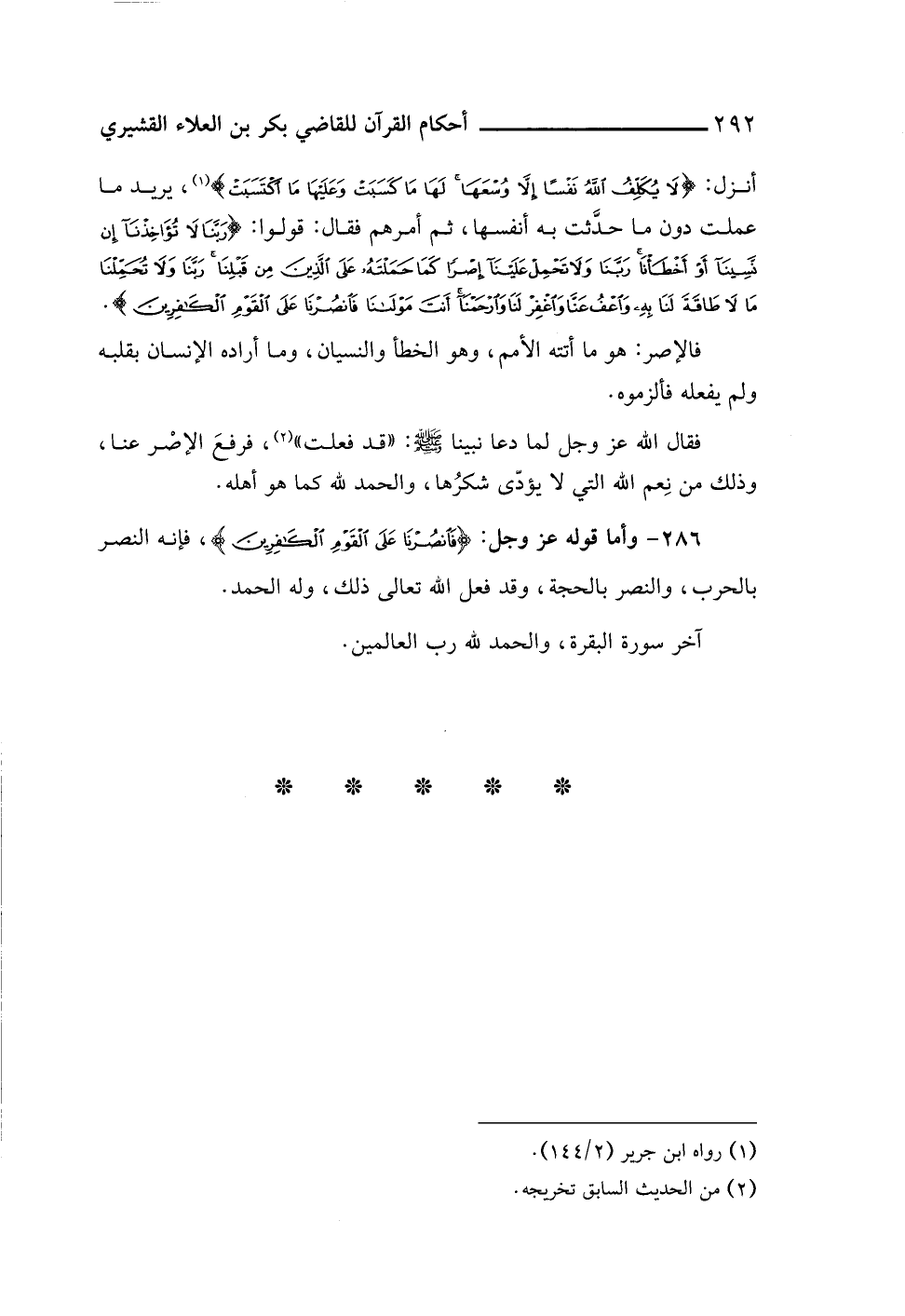 ٢٨٦ - وأما قوله عز وجل: {فَانْصُرْنَا عَلَى الْقَوْمِ الْكَافِرِينَ}، فإنه النصر بالحرب، والنصر بالحجة، وقد فعل اللَّه تعالى ذلك، وله الحمد.