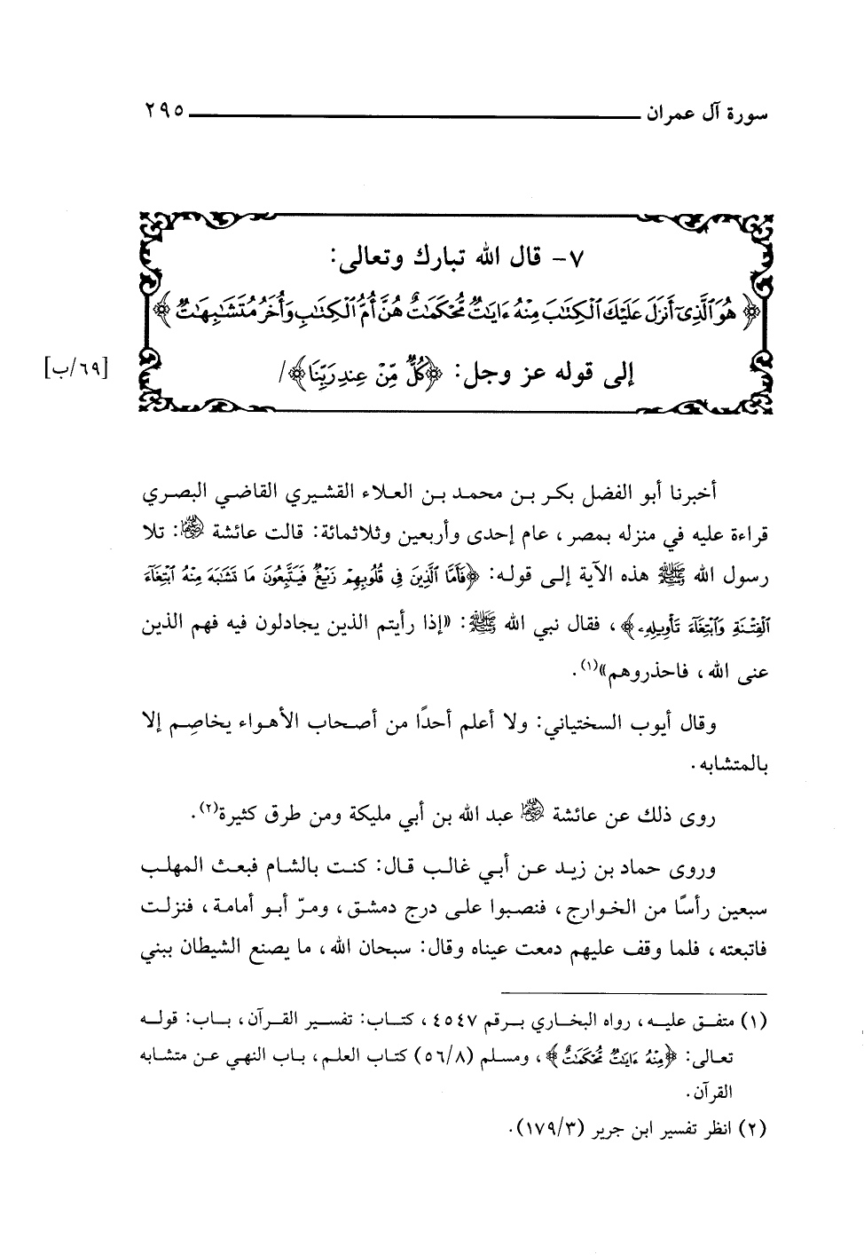 أخبرنا أبو الفضل بكر بن محمد بن العلاء القشيري القاضي البصري قراءة عليه في منزله بمصر، عام إحدى وأربعين وثلاثمائة: قالت عائشة -رضي اللَّه عنها-: تلا رسول اللَّه -صلى اللَّه عليه وسلم- هذه الآية إلى قوله: {فَأَمَّا الَّذِينَ فِي قُلُوبِهِمْ زَيْغٌ فَيَتَّبِعُونَ مَا تَشَابَهَ مِنْهُ ابْتِغَاءَ الْفِتْنَةِ وَابْتِغَاءَ تَأْوِيلِهِ}، فقال نبي اللَّه -صلى اللَّه عليه وسلم-: "إذا رأيتم الذين جادلون فيه فهم الذين عنى اللَّه، فاحذروهم" (¬١).