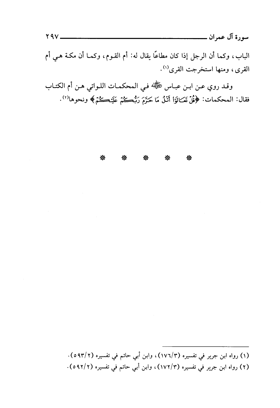 وقد روي عن ابن عباس -رضي اللَّه عنه- في المحكمات اللواتي هن أم الكتاب فقال: المحكمات: {قُلْ تَعَالَوْا أَتْلُ مَا حَرَّمَ رَبُّكُمْ عَلَيْكُمْ} ونحوها (¬٢).