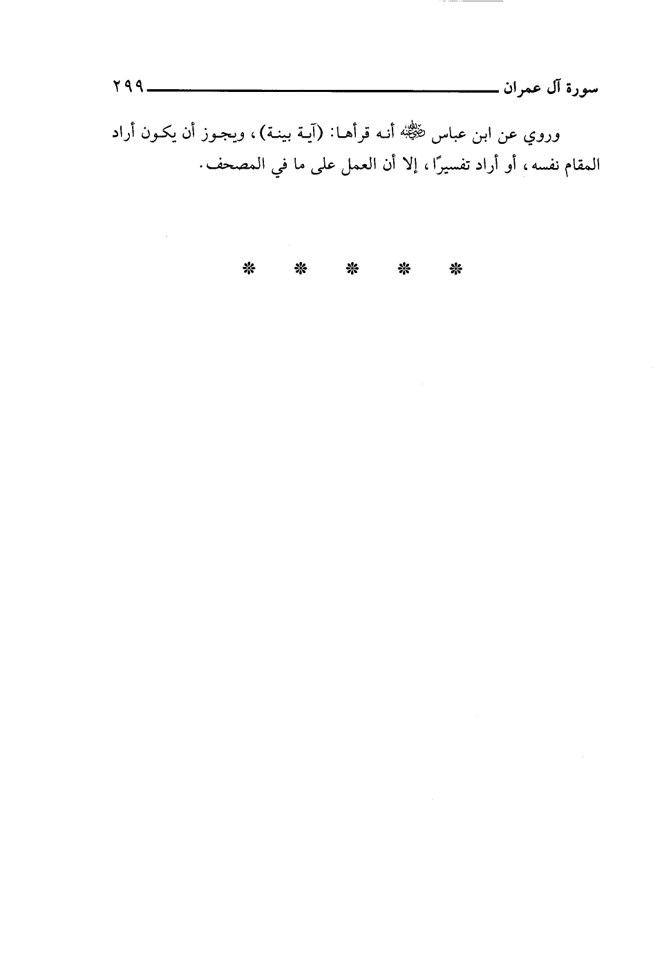 وروي عن ابن عباس -رضي اللَّه عنه- أنه قرأها: (آية بينة)، ويجوز أن يكون أراد المقام نفسه، أو أراد تفسيرًا، إلا أن العمل على ما في المصحف.