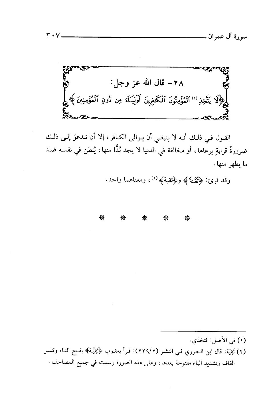 (¬٢) تَقِيّة: قال ابن الجزري في النشر (٢/ ٢٢٩): قرأ يعقوب {تَقِيَّة} بفتح التاء وكسر القاف وتشديد الياء مفتوحة بعدها، وعلى هذه الصورة رسمت في جميع المصاحف.