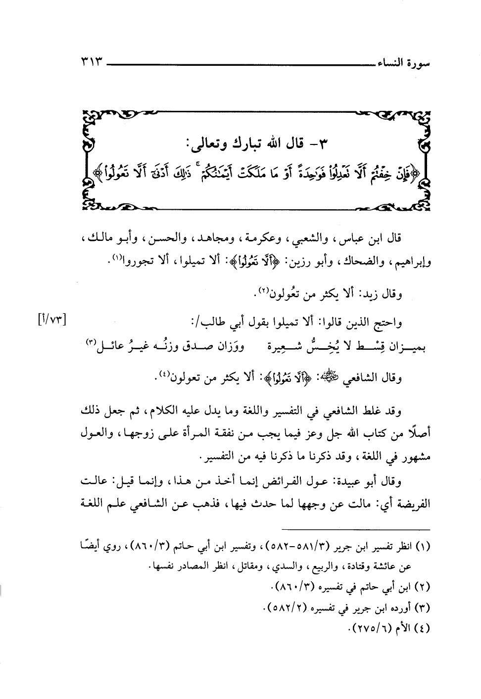 وقال الشافعي -رضي اللَّه عنه-: {أَلَّا تَعُولُوا}: ألا يكثر من تعولون (¬٤).