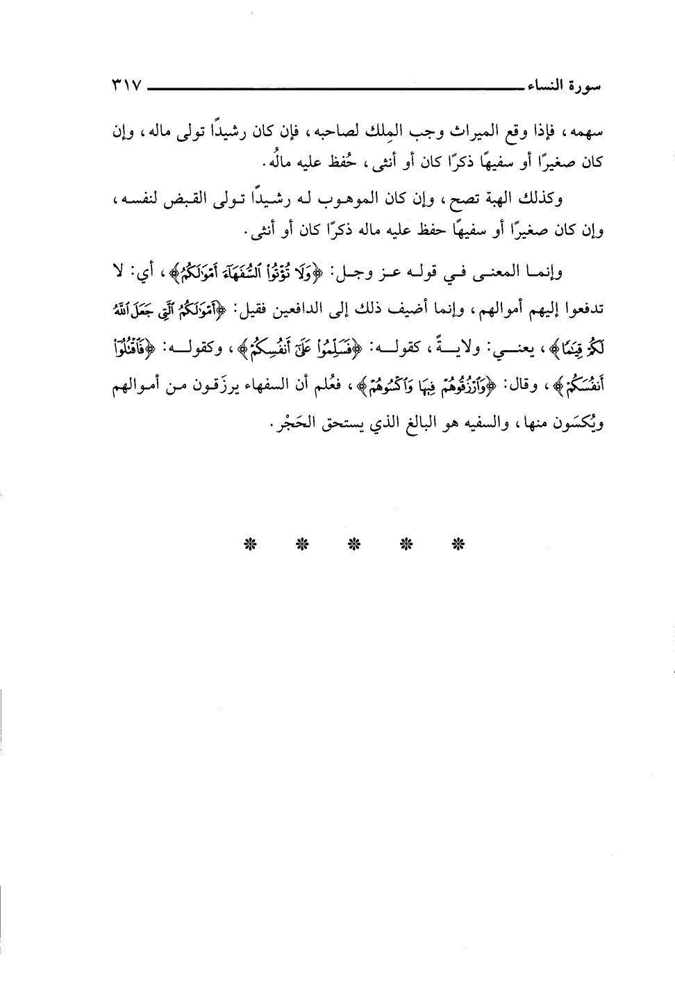 وإنما المعنى في قوله عز وجل: {وَلَا تُؤْتُوا السُّفَهَاءَ أَمْوَالَكُمُ}، أي: لا تدفعوا إليهم أموالهم، وإنما أضيف ذلك إلى الدافعين فقيل: {أَمْوَالَكُمُ الَّتِي جَعَلَ اللَّهُ لَكُمْ قِيَامًا}، يعني: ولايةً، كقوله: {فَسَلِّمُوا عَلَى أَنْفُسِكُمْ}، وكقوله: {فَاقْتُلُوا أَنْفُسَكُمْ}، وقال: {وَارْزُقُوهُمْ فِيهَا وَاكْسُوهُمْ}، فعُلم أن السفهاء يرزَقون من أموالهم ويُكسَون منها، والسفيه هو البالغ الذي يستحق الحَجْر.