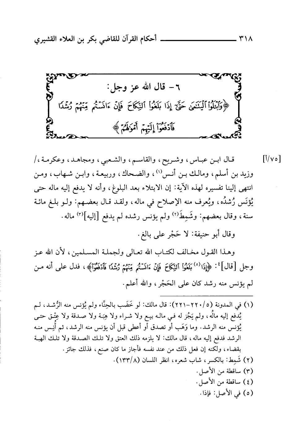 ٦ - قال اللَّه عز وجل: {وَابْتَلُوا الْيَتَامَى حَتَّى إِذَا بَلَغُوا النِّكَاحَ فَإِنْ آنَسْتُمْ مِنْهُمْ رُشْدًا فَادْفَعُوا إِلَيْهِمْ أَمْوَالَهُمْ}
