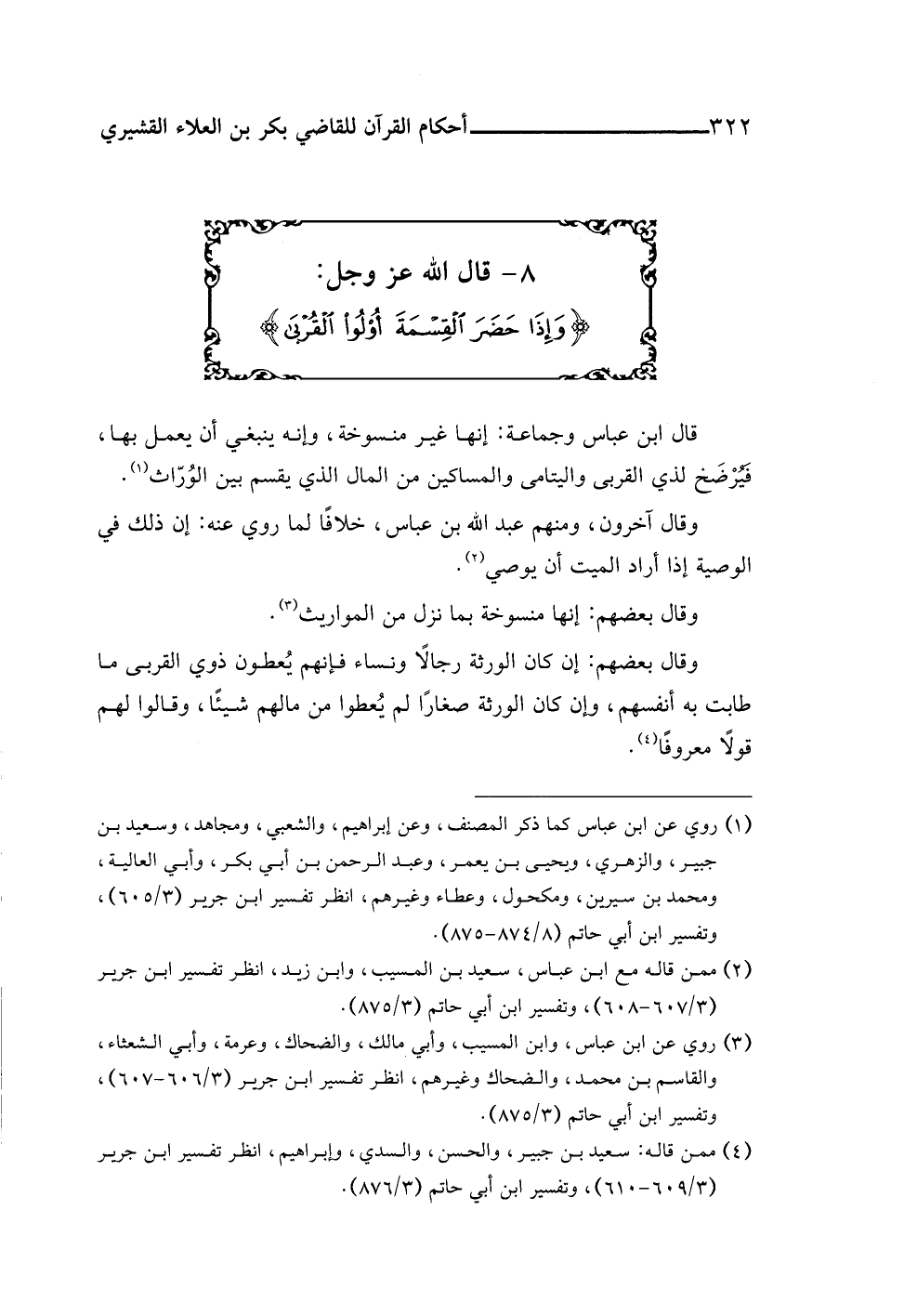 قال ابن عباس وجماعة: إنها غير منسوخة، وإنه ينبغي أن يعمل بها، فيرْضَخ لذي القربى واليتامى والمساكين من المال الذي يقسم بين الوُرّاث (¬١).