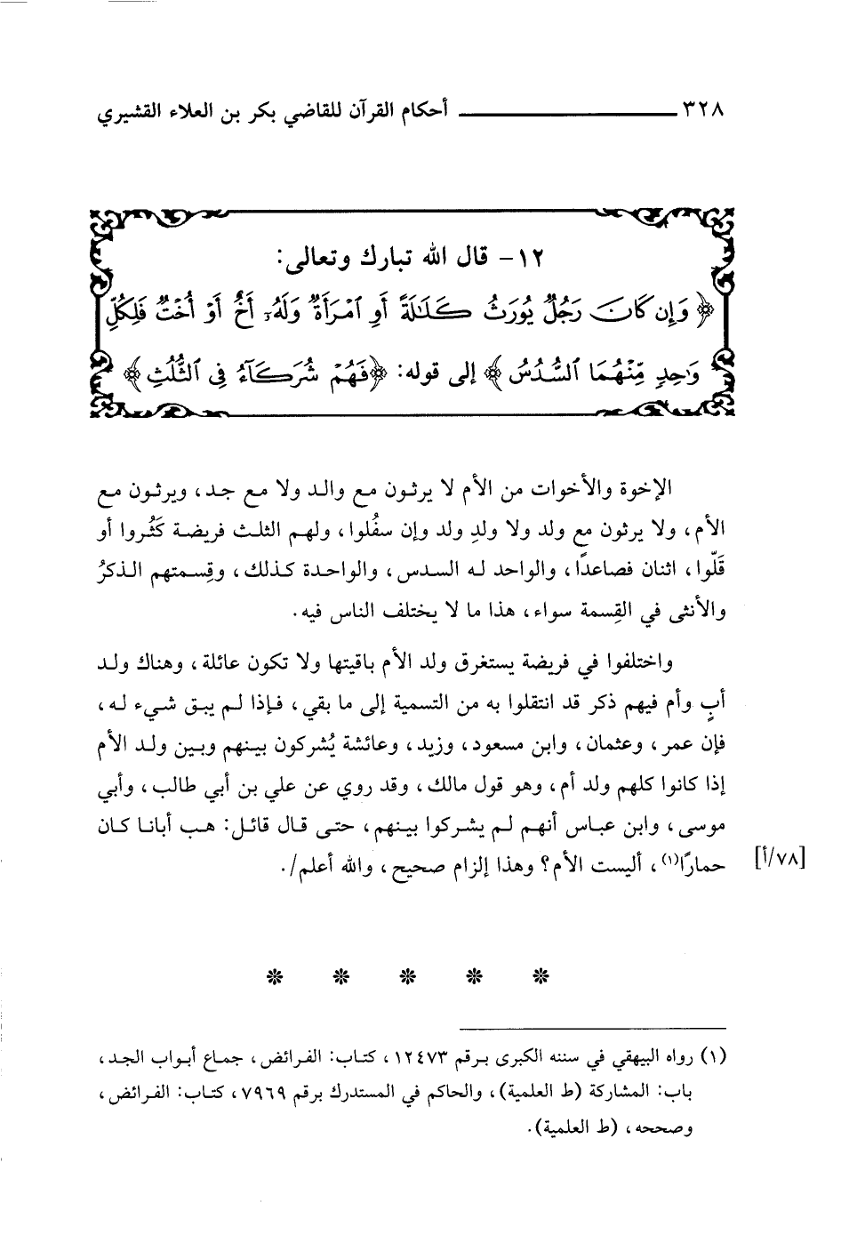 ١٢ - قال اللَّه تبارك وتعالى: {وَإِنْ كَانَ رَجُلٌ يُورَثُ كَلَالَةً أَوِ امْرَأَةٌ وَلَهُ أَخٌ أَوْ أُخْتٌ فَلِكُلِّ وَاحِدٍ مِنْهُمَا السُّدُسُ} إلى قوله: {فَهُمْ شُرَكَاءُ فِي الثُّلُثِ}