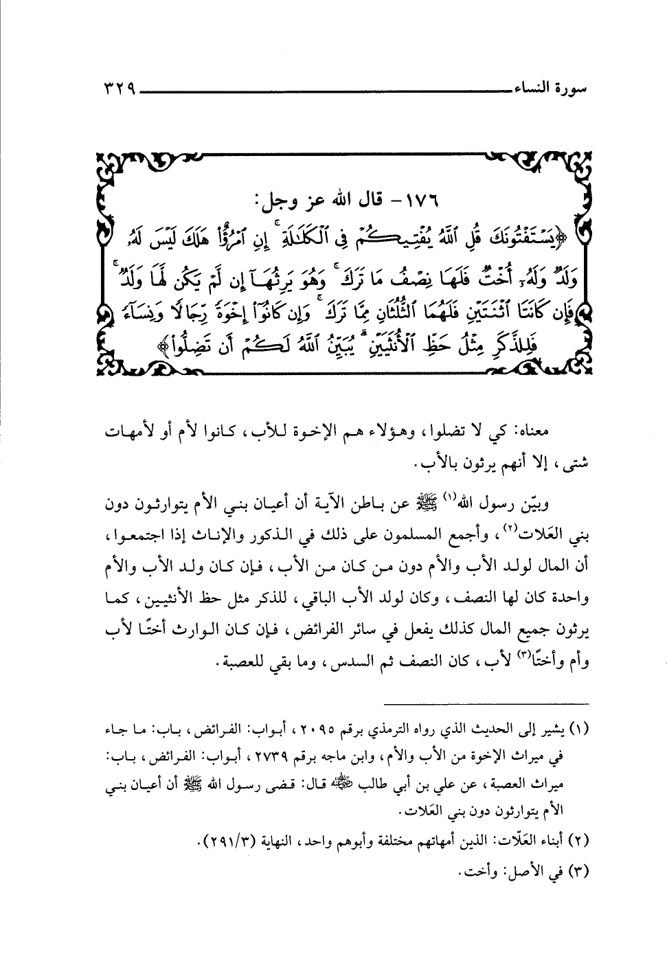 ١٧٦ - قال اللَّه عز وجل: {يَسْتَفْتُونَكَ قُلِ اللَّهُ يُفْتِيكُمْ فِي الْكَلَالَةِ إِنِ امْرُؤٌ هَلَكَ لَيْسَ لَهُ وَلَدٌ وَلَهُ أُخْتٌ فَلَهَا نِصْفُ مَا تَرَكَ وَهُوَ يَرِثُهَا إِنْ لَمْ يَكُنْ لَهَا وَلَدٌ فَإِنْ كَانَتَا اثْنَتَيْنِ فَلَهُمَا الثُّلُثَانِ مِمَّا تَرَكَ وَإِنْ كَانُوا إِخْوَةً رِجَالًا وَنِسَاءً فَلِلذَّكَرِ مِثْلُ حَظِّ الْأُنْثَيَيْنِ يُبَيِّنُ اللَّهُ لَكُمْ أَنْ تَضِلُّوا}