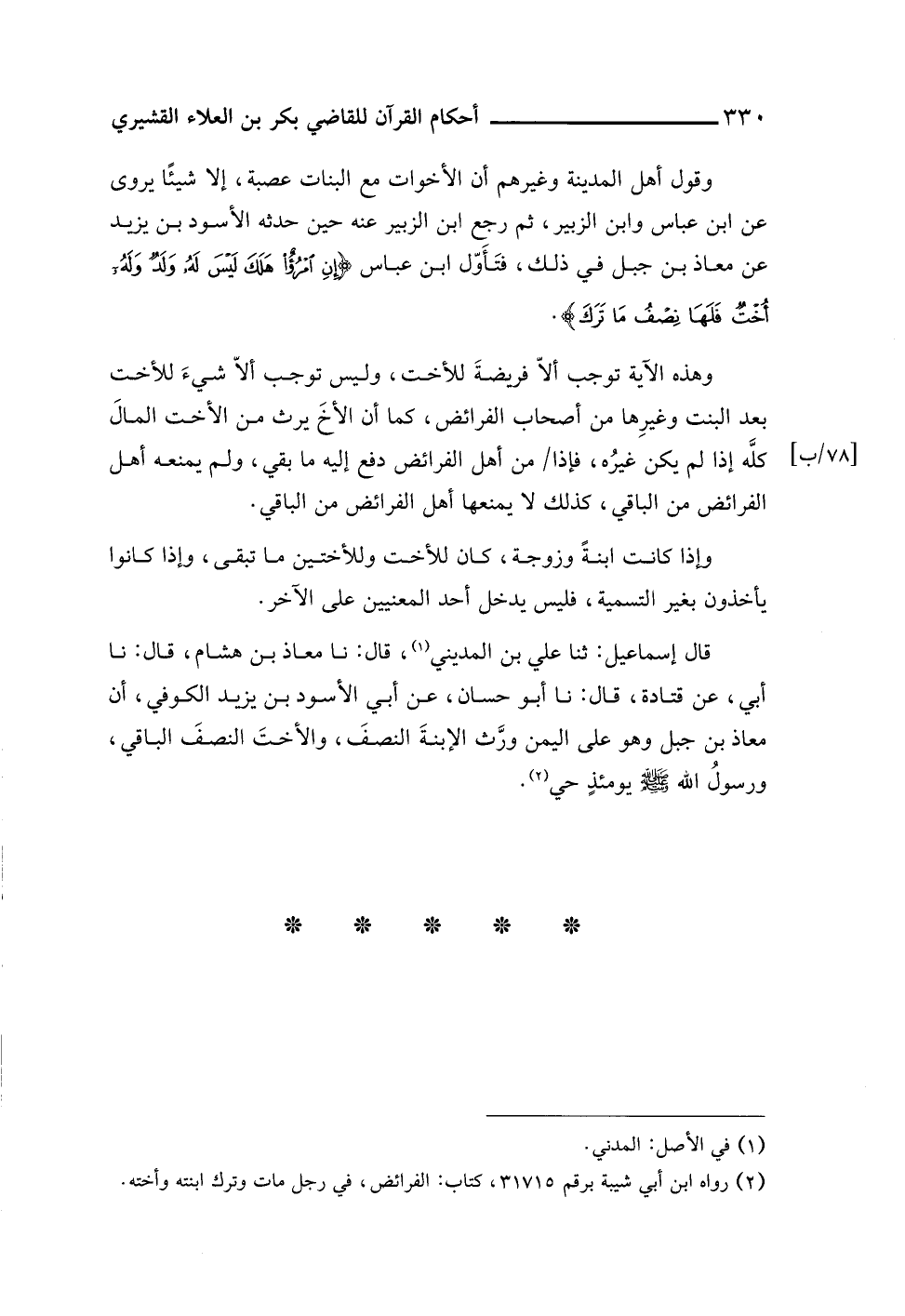 قال إسماعيل: ثنا علي بن المديني (¬١)، قال: نا معاذ بن هشام، قال: نا أبي، عن قتادة، قال: نا أبو حسان، عن أبي الأسود بن يزيد الكوفي، أن معاذ بن جبل وهو على اليمن ورَّث الإبنةَ النصفَ، والأختَ النصفَ الباقي، ورسولُ اللَّه -صلى اللَّه عليه وسلم- يومئذٍ حي (¬٢).