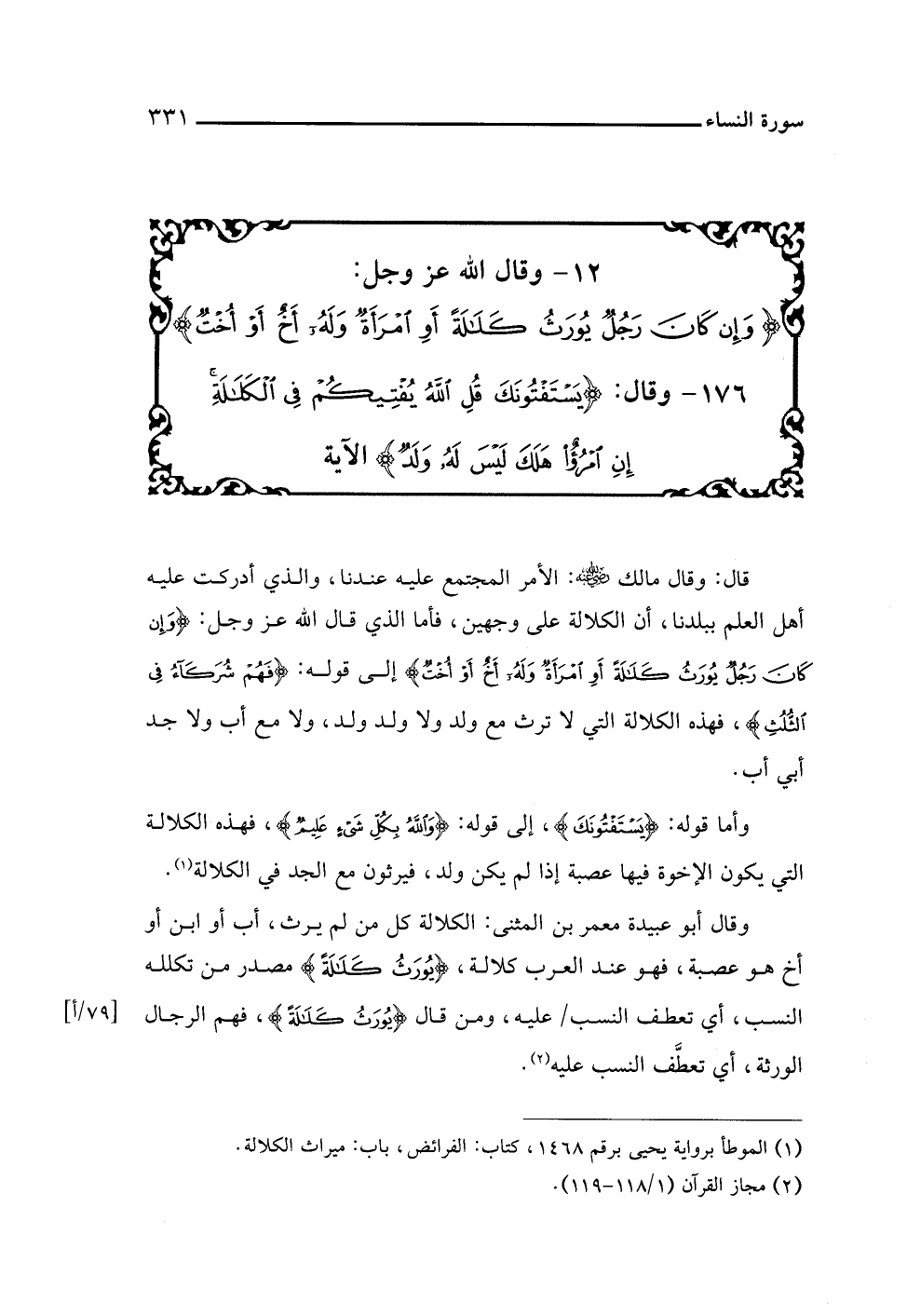 ١٢ - وقال اللَّه عز وجل: {وَإِنْ كَانَ رَجُلٌ يُورَثُ كَلَالَةً أَوِ امْرَأَةٌ وَلَهُ أَخٌ أَوْ أُخْتٌ} ١٧٦ - وقال: {يَسْتَفْتُونَكَ قُلِ اللَّهُ يُفْتِيكُمْ فِي الْكَلَالَةِ إِنِ امْرُؤٌ هَلَكَ لَيْسَ لَهُ وَلَدٌ} الآية