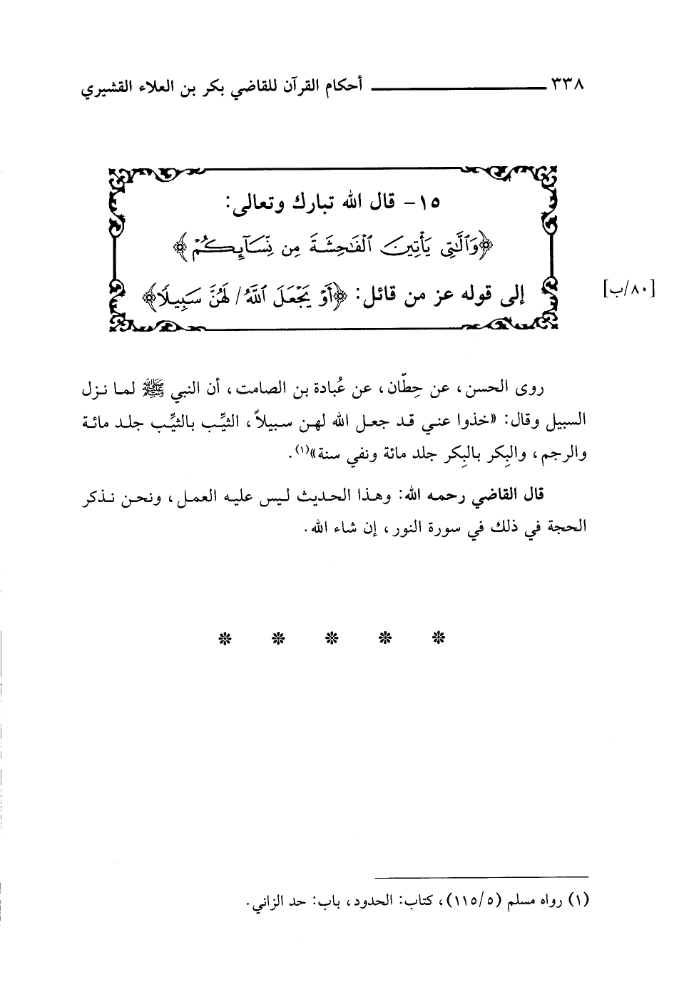 قال القاضي رحمه اللَّه: وهذا الحديث ليس عليه العمل، ونحن نذكر الحجة في ذلك في سورة النور، إن شاء اللَّه.