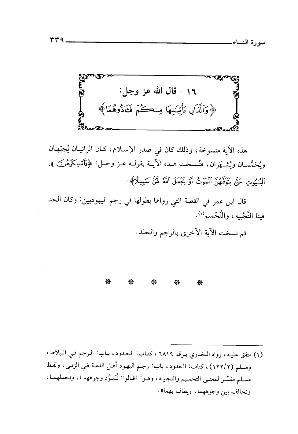 ١٦ - قال اللَّه عز وجل: {وَاللَّذَانِ يَأْتِيَانِهَا مِنْكُمْ فَآذُوهُمَا}