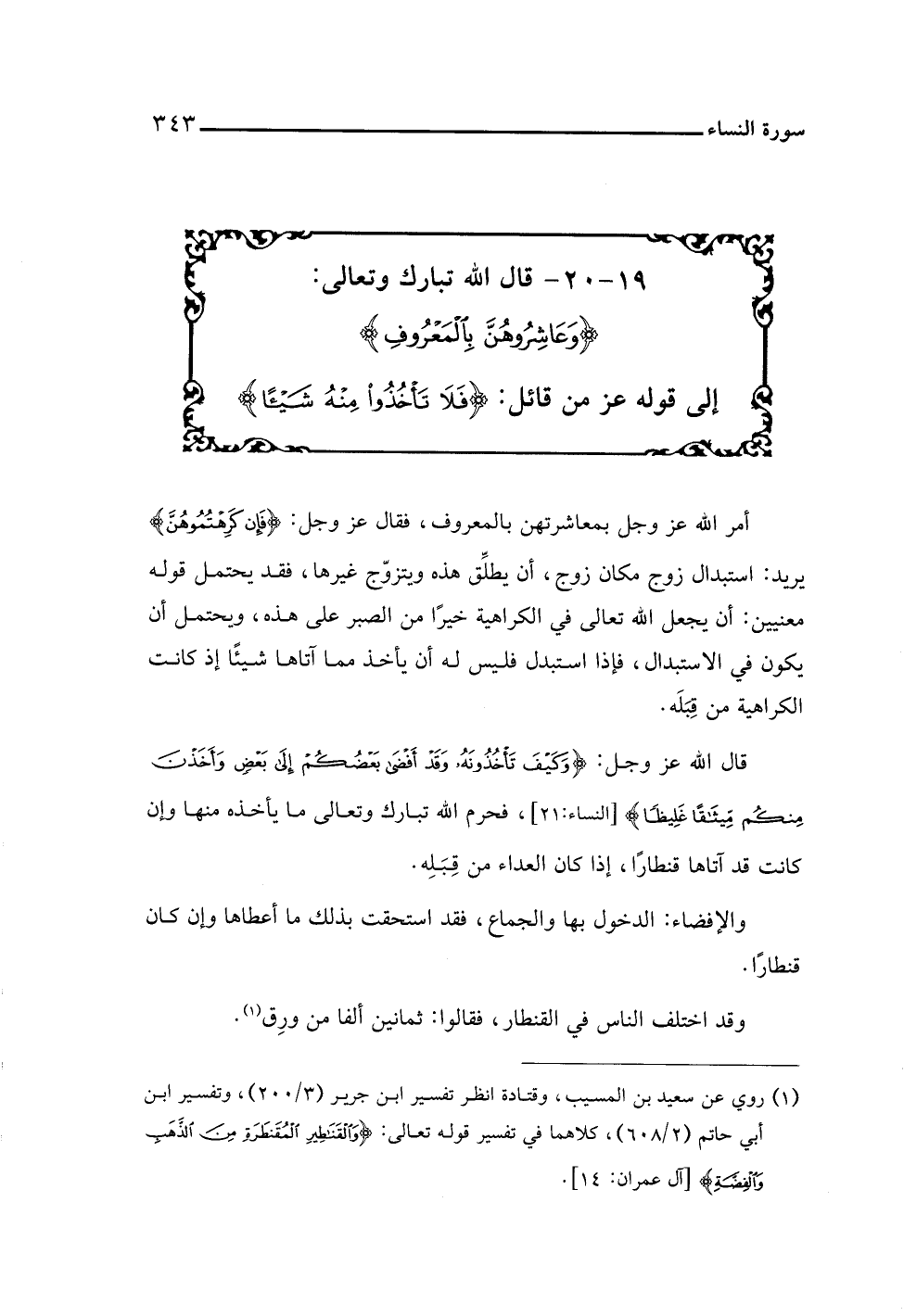 ١٩ - ٢٠ - قال اللَّه تبارك وتعالى: {وَعَاشِرُوهُنَّ بِالْمَعْرُوفِ} إلى قوله عز من قائل: {فَلَا تَأْخُذُوا مِنْهُ شَيْئًا}