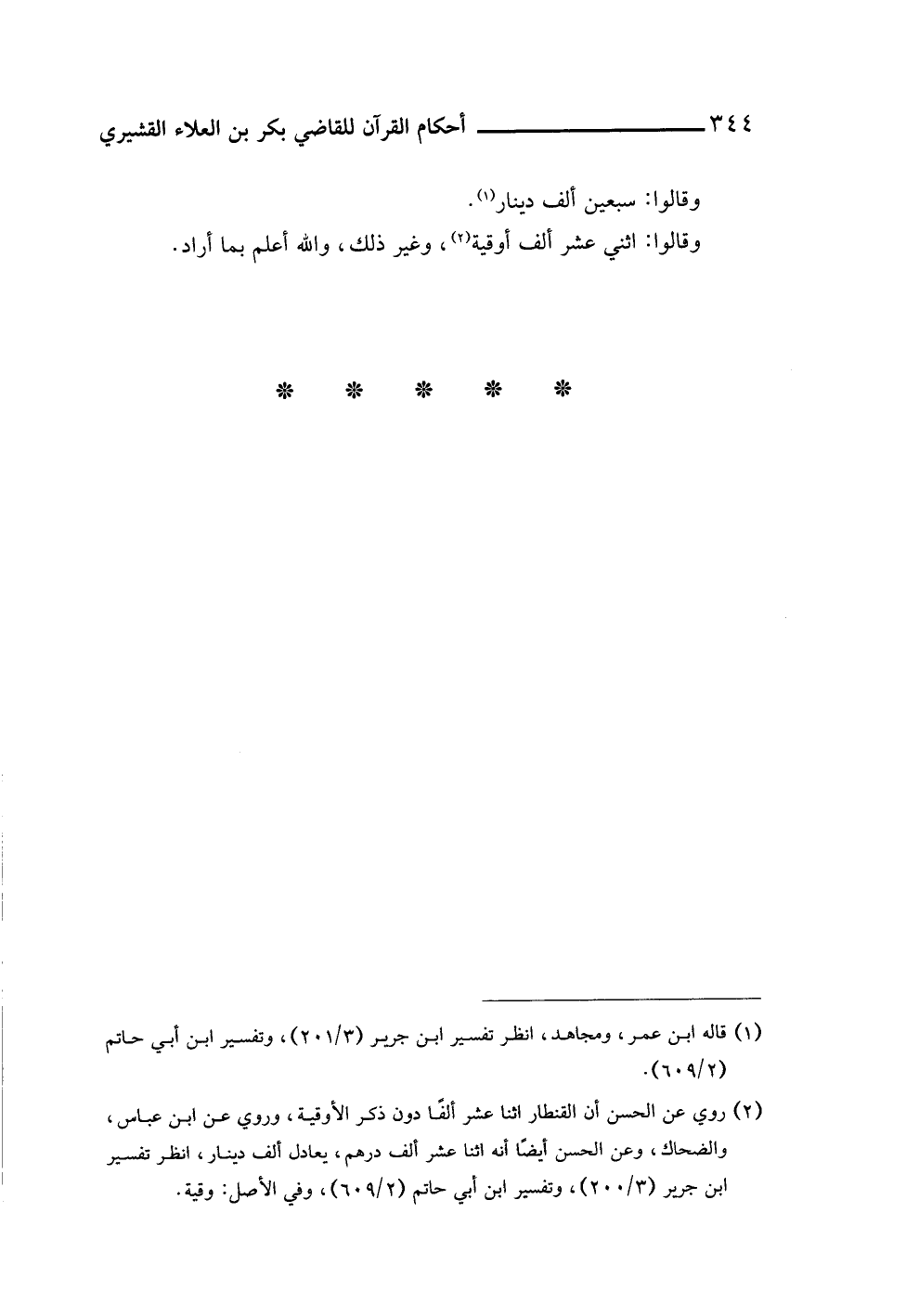 (¬٢) روي عن الحسن أن القنطار اثنا عشر ألفًا دون ذكر الأوقية، وروي عن ابن عباس، والضحاك، وعن الحسن أيضًا أنه اثنا عشر ألف درهم، يعادل ألف دينار، انظر تفسير ابن جرير (٣/ ٢٠٠)، وتفسير ابن أبي حاتم (٢/ ٦٨٩)، وفي الأصل: وقية.