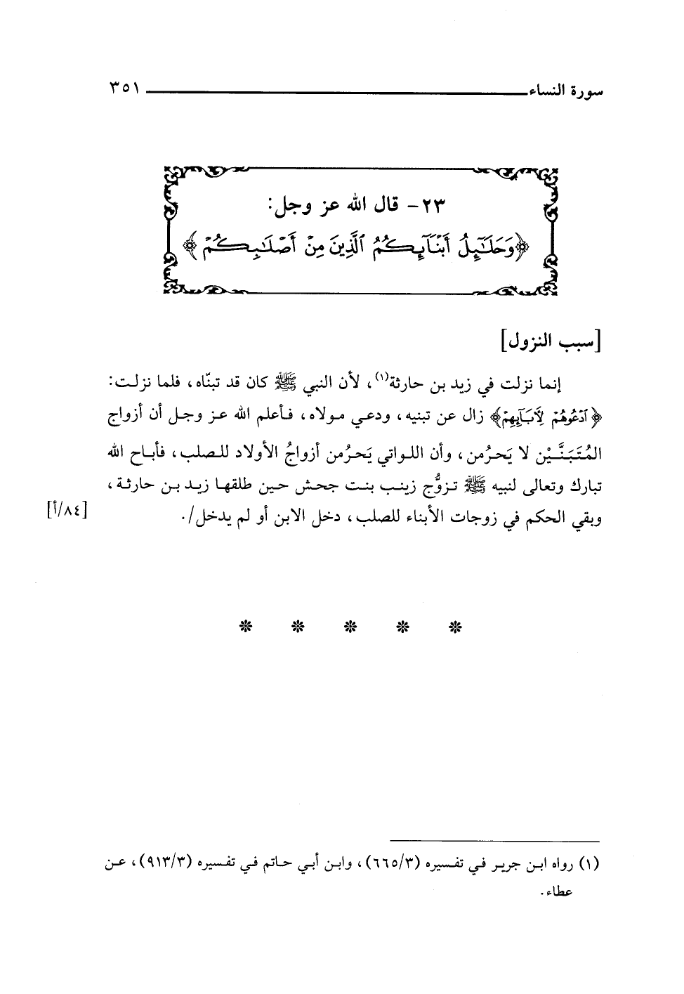 ٢٣ - قال اللَّه عز وجل: {وَحَلَائِلُ أَبْنَائِكُمُ الَّذِينَ مِنْ أَصْلَابِكُمْ}