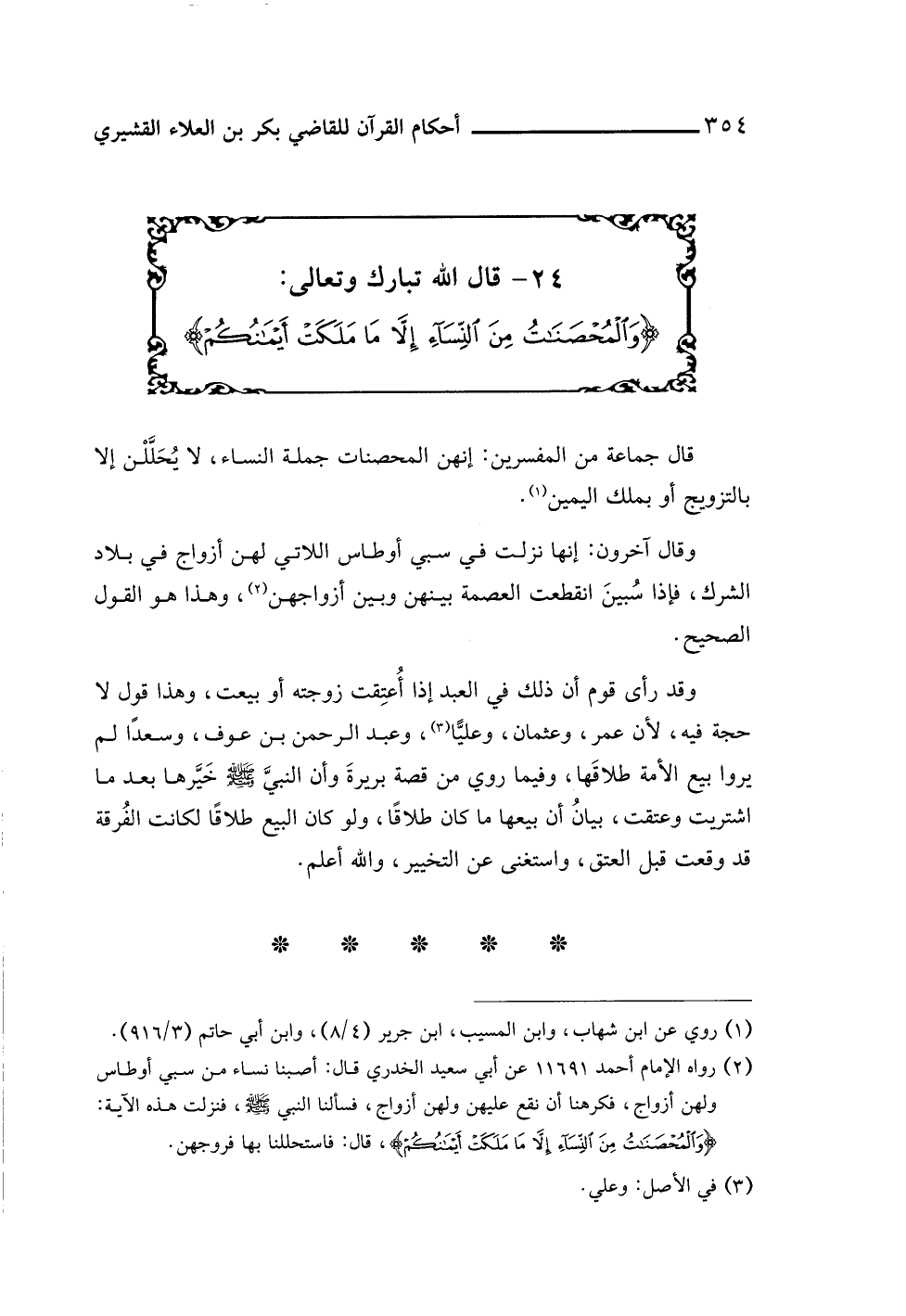 ٢٤ - قال اللَّه تبارك وتعالى: {وَالْمُحْصَنَاتُ مِنَ النِّسَاءِ إِلَّا مَا مَلَكَتْ أَيْمَانُكُمْ}