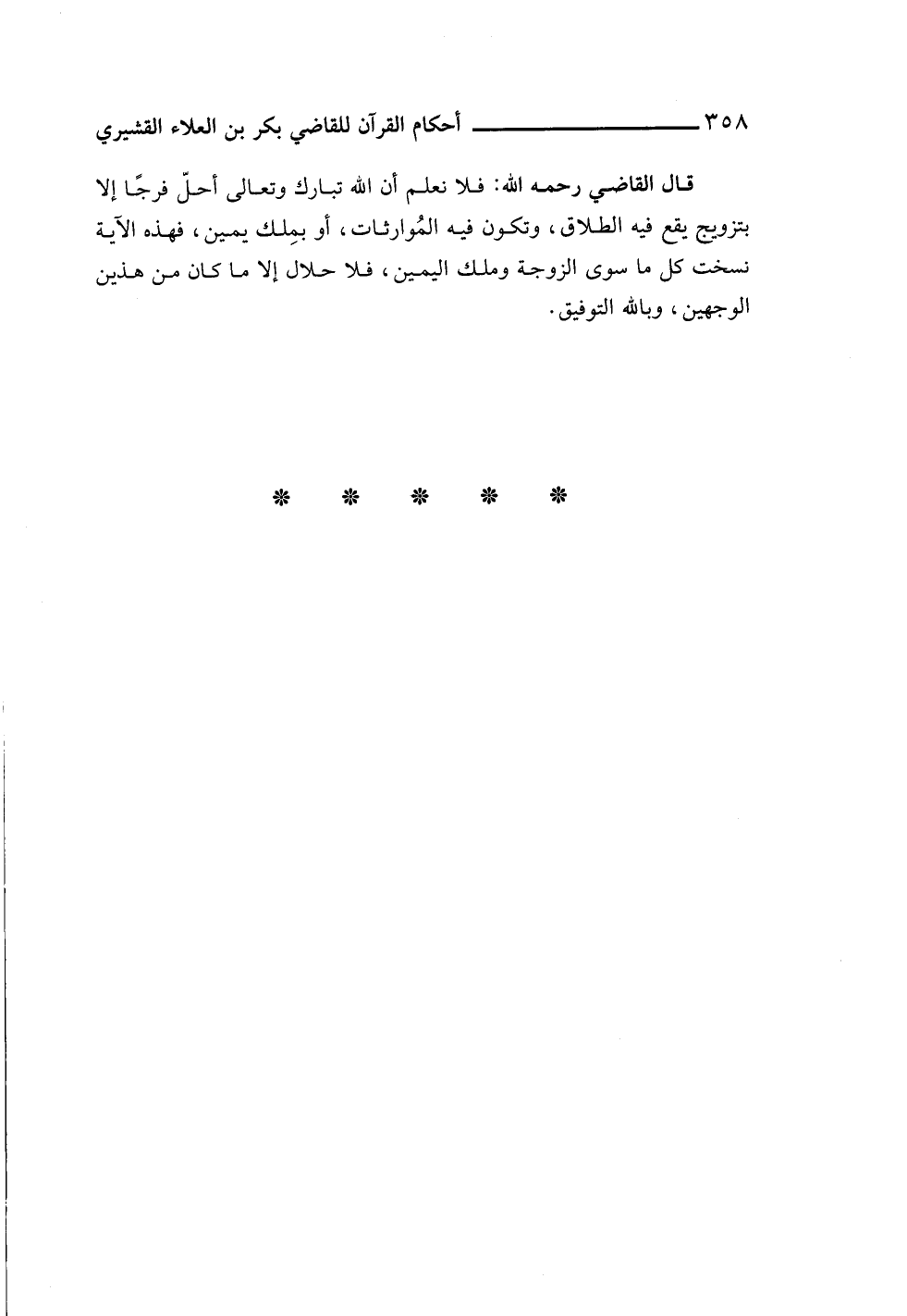قال القاضي رحمه اللَّه: فلا نعلم أن اللَّه تبارك وتعالى أحلّ فرجًا إلا بتزويج يقع فيه الطلاق، وتكون فيه المُوارثات، أو بمِلك يمين، فهذه الآية نسخت كل ما سوى الزوجة وملك اليمين، فلا حلال إلا ما كان من هذين الوجهين، وباللَّه التوفيق.