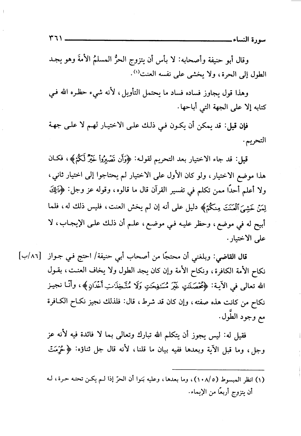 قال القاضي: وبلغني أن محتجًا من أصحاب أبي حنيفة احتج في جواز نكاح الأمة الكافرة، ونكاح الأمة وإن كان يجد الطول ولا يخاف العنت، بقول اللَّه تعالى في الآية: {مُحْصَنَاتٍ غَيْرَ مُسَافِحَاتٍ وَلَا مُتَّخِذَاتِ أَخْدَانٍ}، وأنّا نجيز نكاح من كانت هذه صفته، وإن كان قد شرط، قال فلذلك نجيز نكاح الكافرة مع وجود الطَّول.